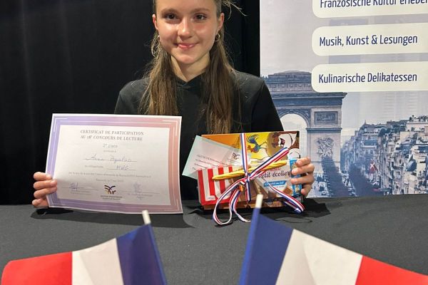 Im April fand deshalb ein schulinterner Vorentscheid statt, bei dem Hannes Geldner, Angie Chen (beide 8b), Kira Grauberger und Josefine Löhr (beide 8c) und Anna Pryvalko (8d) jeweils einen selbstgewählten und einen unbekannten Text vortrugen. Die vier Schüler lasen in der Aula vor ihren Mitschülern und der Jury, bestehend aus Carolina Güllner (11c), Johannes Bruckner (11b) und Freddy Yeyap, dem diesjährigen französischen Freiwilligendienstleistenden. Die dreiköpfige Jury beurteilte die Aussprache und die Intonation der vorgetragenen Texte. Bevor er die Urkunden verlieh, lobte Freddy, wie sicher die Schüler bereits die französische Aussprache beherrschten und wie ausdrucksstark die Texte vorgetragen wurden. Kira erreichte den 3. Platz und Hannes den 2. Platz, während Anna als Gewinnerin das MWG am 7. Mai in der Kleinkunstbühne im Zentrum beim Vorlesewettbewerb der DFG vertrat.