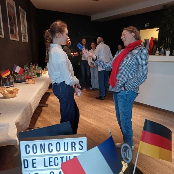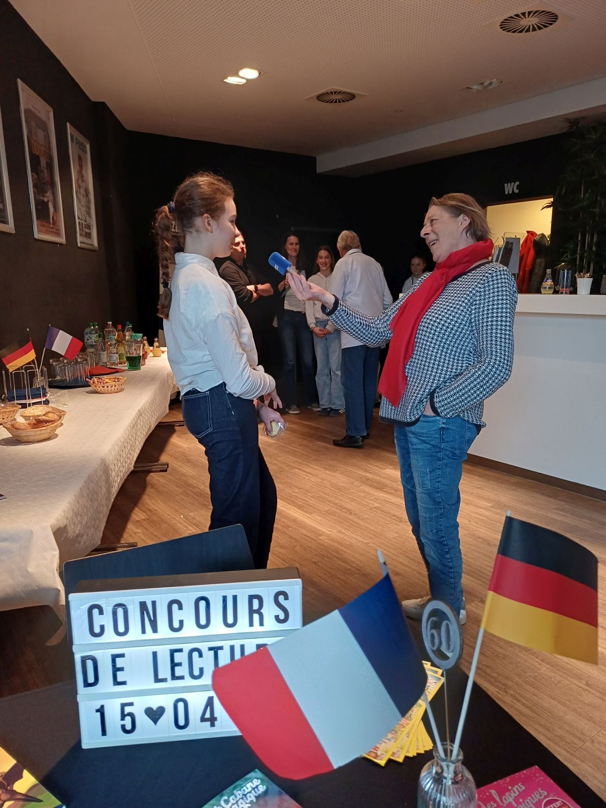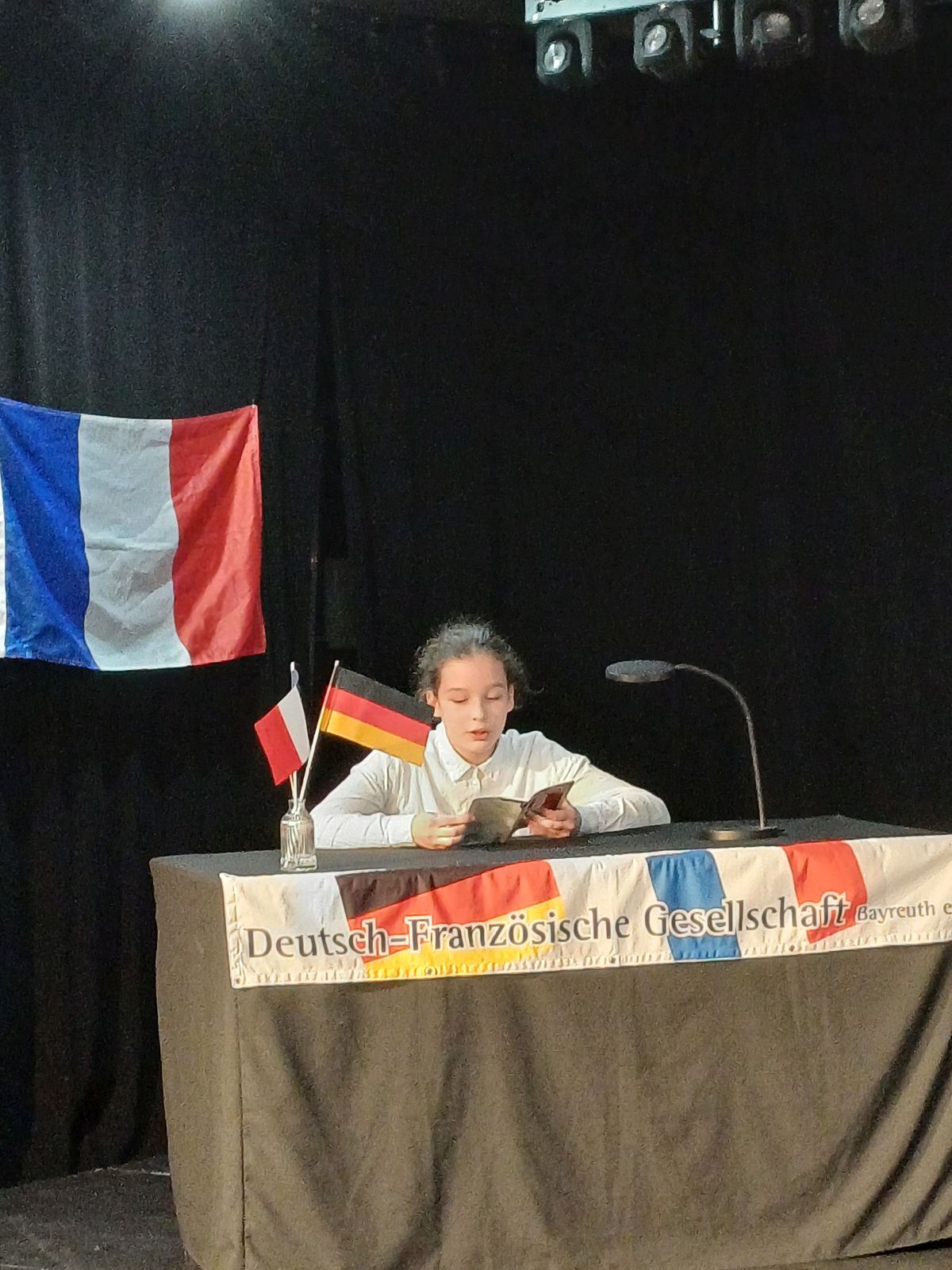Auch dieses Jahr waren die Französisch lernenden Schülerinnen und Schüler der 8. Jahrgangsstufen der Bayreuther und Pegnitzer Gymnasien, der Gesamtschule Hollfeld sowie der 9. Jahrgangsstufe der beiden Bayreuther Realschulen dazu aufgerufen, ihr Können in einem Vorlesewettbewerb zu messen. Dieser fand am 15.4.26 am Nachmittag in der Kleinkunstbühne des Zentrums statt. Der Kurs 8cde des MWG schickte die Schülerin Elina Stannow ins Rennen. Elina suchte ein Kapitel aus der Lektüre „Opération cadeau“ von Anne-Marie Le Plouhinec aus, überlegte sich einige einführende Sätze und trug ihren Text vor einer fünfköpfigen französischen Jury souverän vor. In der 2. Runde mussten die drei angetretenen Schülerinnen des MWG, des GMG und des Gymnasiums Pegnitz sowie der Schüler des WWG einen recht schwierigen unbekannten Text vorlesen, den die Jury ausgewählt hatte. Überbrückt wurden die Beratungspausen der Jury durch Einblicke in die Arbeit und die Termine der DFG im Jubiläumsjahr der Partnerschaft zwischen Bayreuth und Annecy, insbesondere aber durch ein liebevoll erstelltes Buffet mit französischen Spezialitäten. Es gab das grüne Getränk Diabolo menthe, Madeleines, französische Kekse, Karamellstangen der Marke Carambar, so dass auch hier vor allem im Zusammenhang mit der tollen Dekoration für französisches Ambiente gesorgt wurde. Elina gewann mit ihrem lebendigen Vortragsstil den 2. Platz, Siegerin wurde die Schülerin des GMG. Félicitations, Elina!