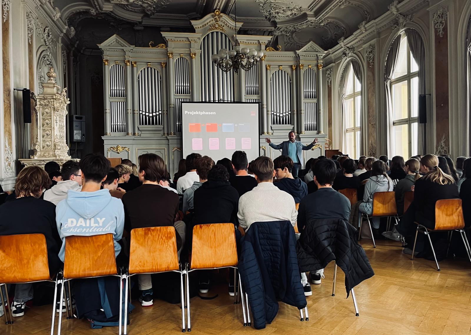 Am 14. Oktober 2025 fiel in der Aula der Startschuss zur neuen Projektrunde. Getreu dem Motto „Never change a winning team“ eröffnete erneut Klaus Herold von der Firma medi die Arbeitsphase mit einem fesselnden Vortrag zum Thema Projektmanagement. Der MWG-Alumnus verstand es dabei eindrucksvoll, den Jugendlichen die ersten vermeintlich „großen“ Hürden der Projektarbeit zu nehmen und ihnen Mut zu machen, sich Schritt für Schritt an die Umsetzung ihrer eigenen Geschäftsideen heranzutasten.