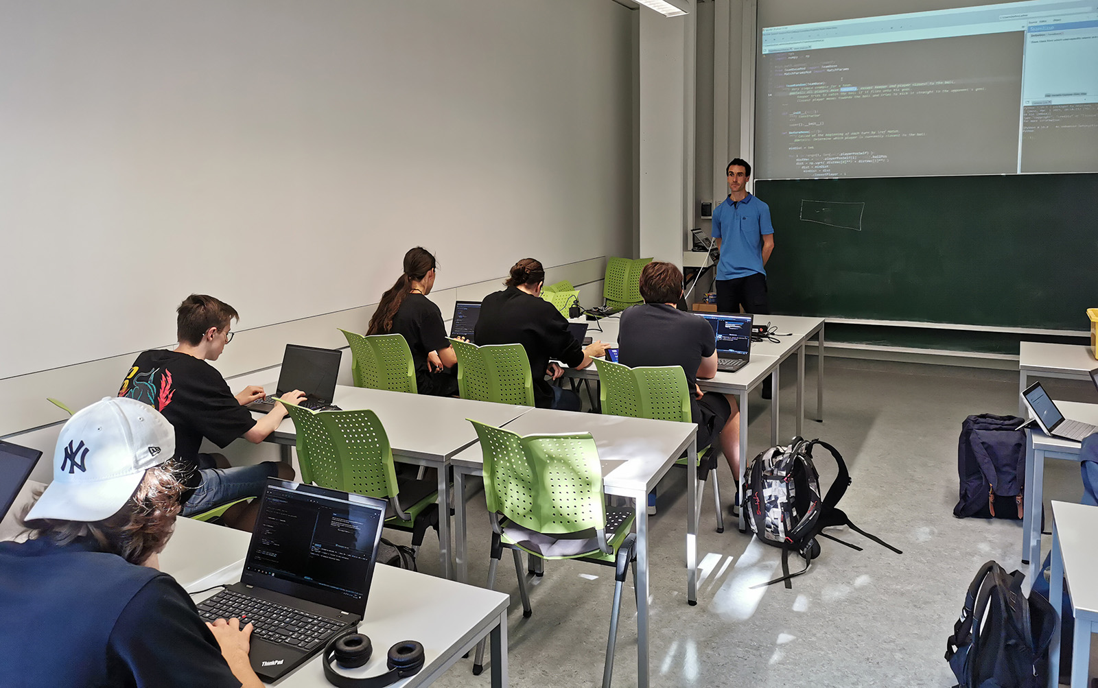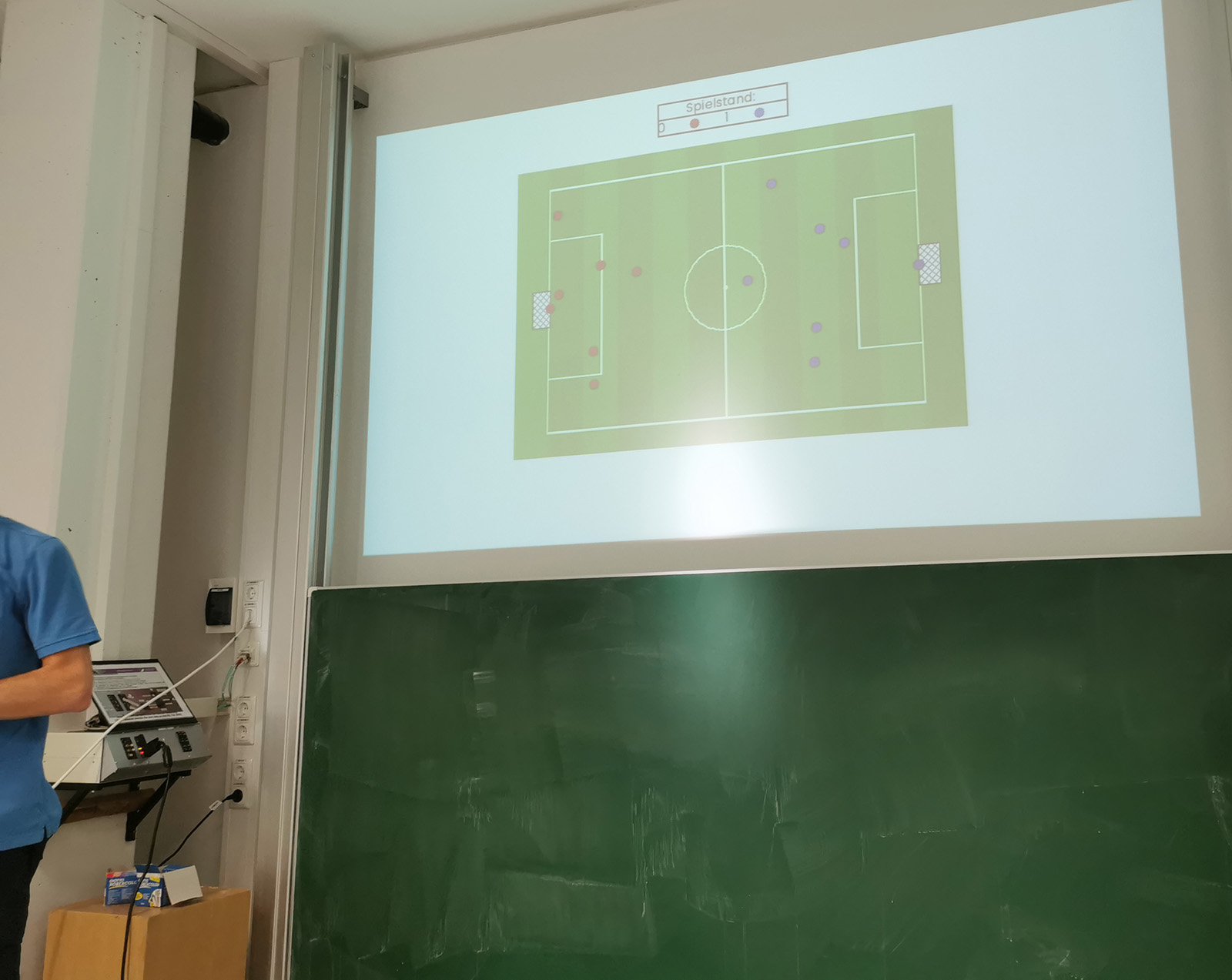 Was hat dies nun mit Informatik oder gar Physik zu tun? Eine ganze Menge! Die Plattform bietet kein Computerspiel wie „Fifa“ oder dergleichen, bei welchen der Benutzer die Spieler live steuert, sondern es muss vorab ein Programm zur Steuerung entwickelt werden. Anschließend wird der eigene Code in einer Simulation getestet. Es geht also darum, eine effiziente Spielstrategie zu finden. Wie sollen sich die Spieler in verschiedenen Situationen, z.B. bei Ballkontakt, verhalten? Wie ist die Bewegung des Balls mithilfe von Vektoren und anderen Faktoren, beispielsweise der Geschwindigkeit oder der Trefferwahrscheinlichkeit, zu bestimmen? Diese und weitere Überlegungen wurden von den Teilnehmenden in ein vorgefertigtes Python-Programm eingepflegt und anschließend getestet.