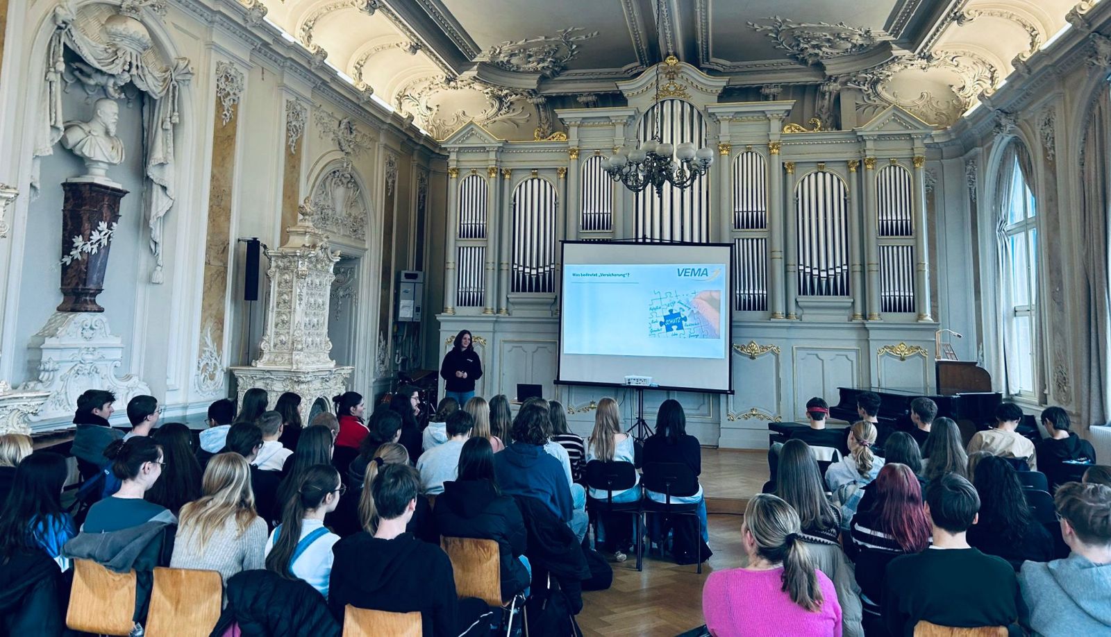 Ende November hatten die Schülerinnen und Schüler der 11. Klassen die Gelegenheit, wertvolles Fachwissen aus der Praxis zu erhalten: Die Vema eG, der größte genossenschaftlich organisierte Verbund von Versicherungsmaklern in Deutschland, besuchte unsere Schule, um im Fach Wirtschaft und Recht einen praxisnahen Vortrag zu halten. Im Zentrum standen die Themen Versicherungen und deren Bedeutung für private Haushalte. Dabei wurde der Lehrplanbezug zu den Kapiteln „Soziale Sicherung“ und „Belastung privater Haushalte durch Steuern und Abgaben“ aufgegriffen.
