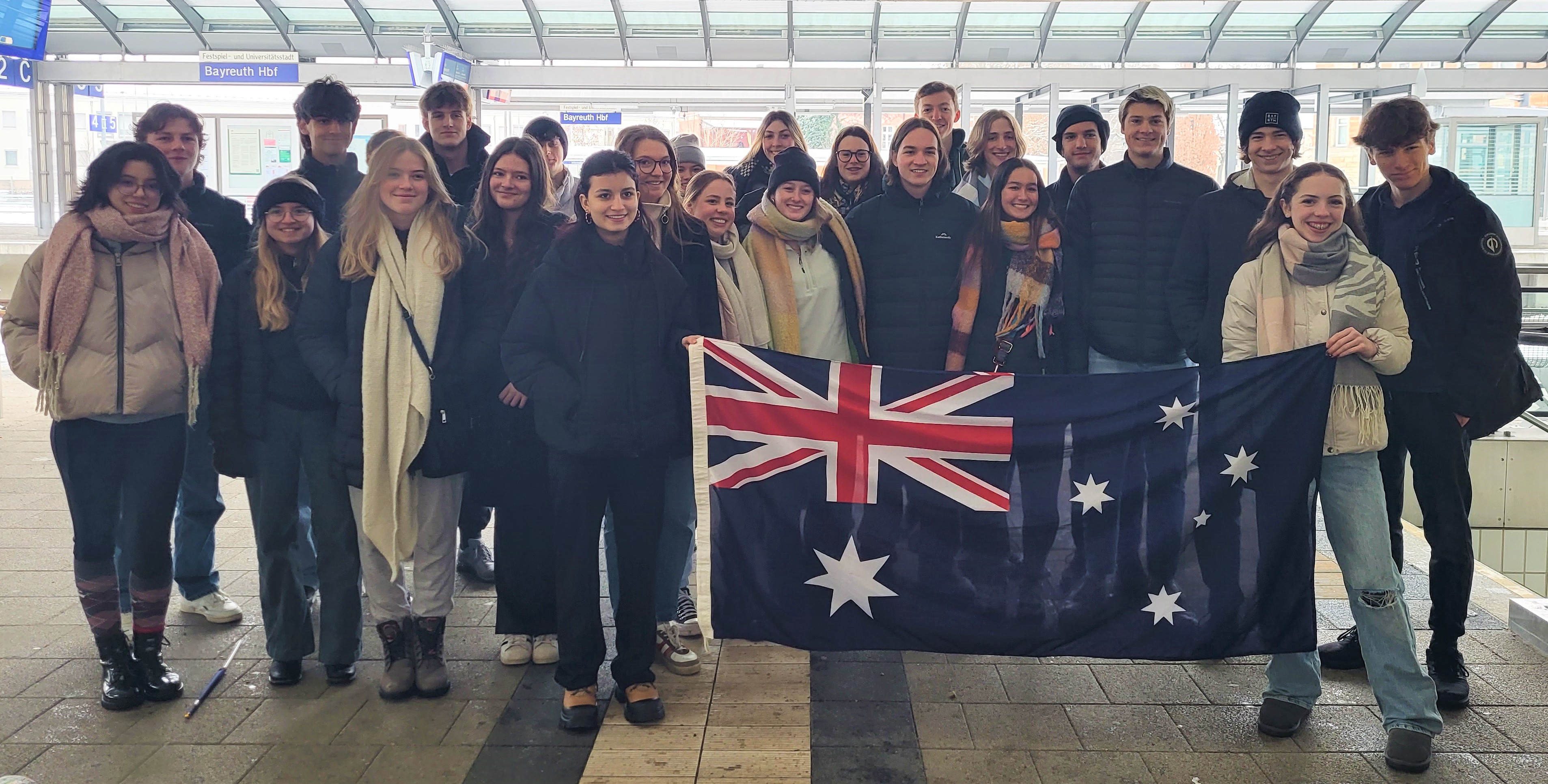 Am 9.12. als in Deutschland gerade Eiszeit herrschte erreichte uns ein Bus mit 14 australischen Schülern und Schülerinnen sowie den drei Begleitlehrkräften und Koordinatoren Jessica Rabe, Ursula Götz und Aaron Richard. Zwar konnten sich die SchülerInnen schon in einem Sprachcamp am Bodensee an die für diese Jahreszeit untypische Kälte gewöhnen, doch war es in Bayreuth nochmals um einiges kälter und der Winter zeigte sich mit Schnee und Eis von seiner schönsten Seite. Auch wenn die Temperaturen weit im Minusbereich waren, war die Stimmung sehr positiv und die Australier wurden wärmstens von den deutschen Gastfamilien empfangen.
