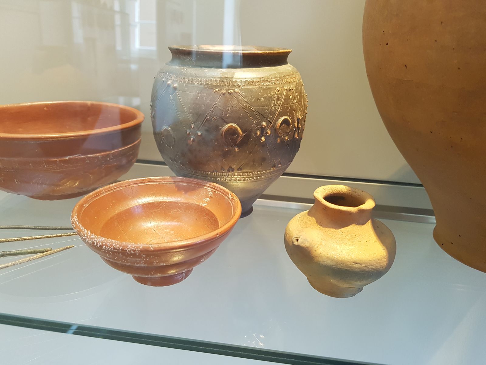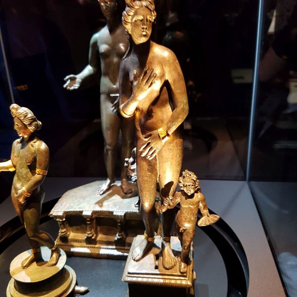 Nach einer Stärkung in der Mittagspause konnten wir im Limes-Informationszentrum viele römische Funde betrachten, die einen Einblick in das römische Leben geben. Ungewöhnlich ist ein Baby-Saugfläschchen aus Keramik. Besonders gut gefielen manchen Schülerinnen goldene oder silberne Schmuckstücke, die zum Teil in der Therme gefunden wurden. Den Höhepunkt stellten die Götterstatuen dar, wie der beliebte Merkur, verschiedene Venusstatuetten oder Herkules mit seinem Löwenfell und dem von ihm erlegten Eber in Kleinformat.