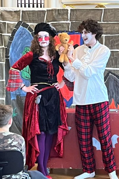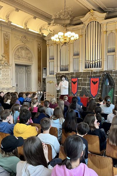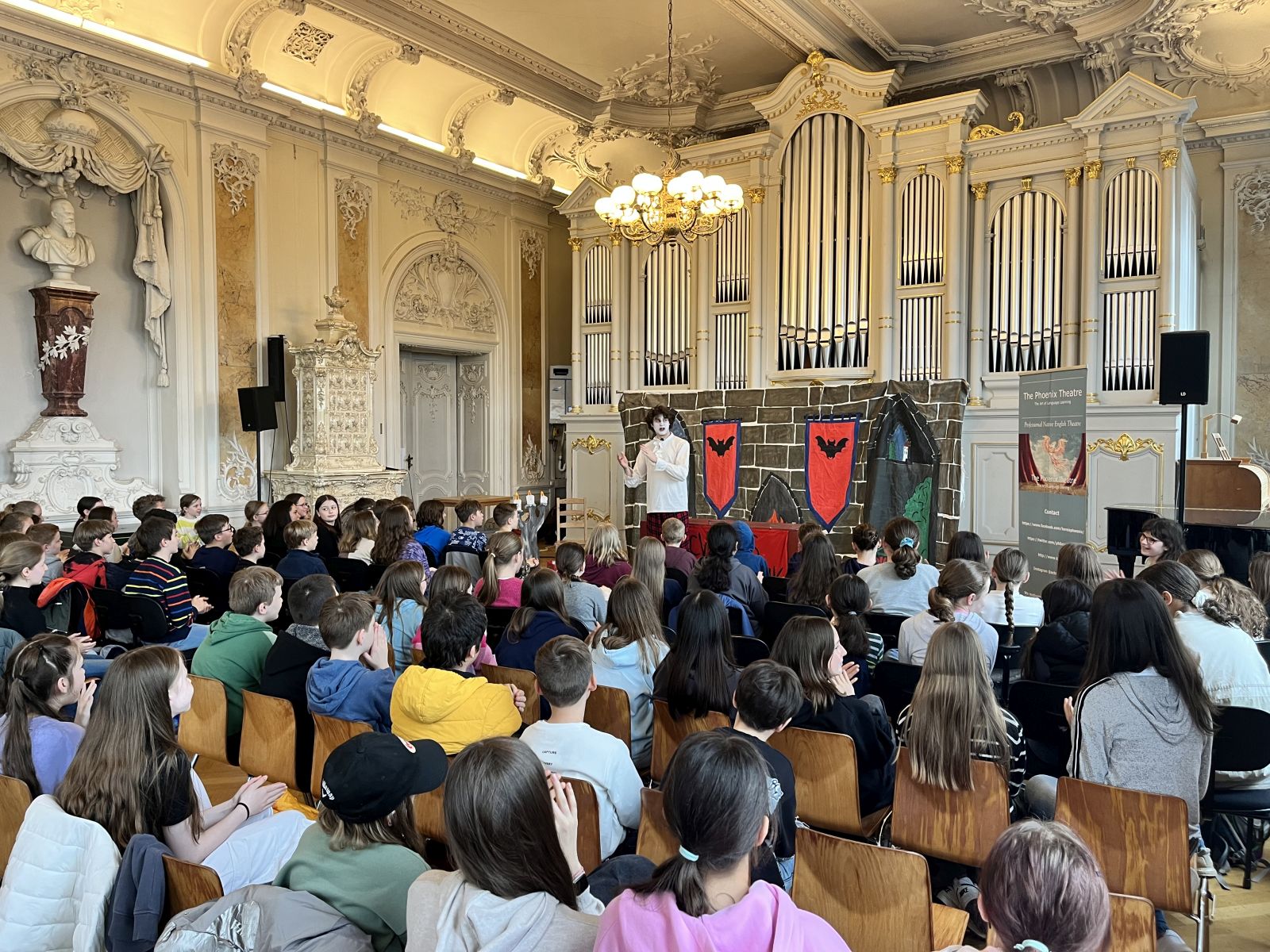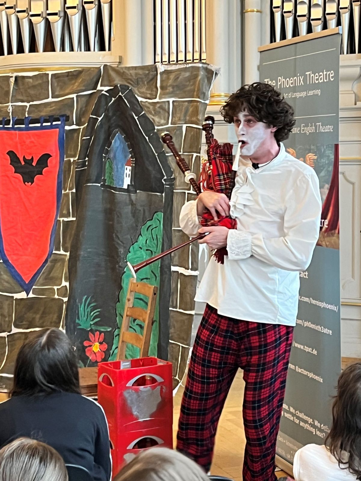 Da wäre auch unsere Studien- und Berufsberatung ratlos: was tun, wenn man als einziger Sohn und Erbe eines schottischen Vampirclans entgegen aller Erwartungen der dominanten Mutter eben nicht in den Betrieb der familieneigenen Blutbank einsteigen will? Sondern von einer Zukunft als Eisdielenbesitzer träumt? Die Schülerinnen und Schüler der sechsten Jahrgangsstufe hatten am English Theatre Day jedenfalls viel Spaß dabei, den Vampirjungen lautstark dabei zu unterstützen, eine Lösung für dieses Problem zu finden. Einige wurden von dem Schauspielergespann des Phoenix Theatres sogar mit auf die Bühne geholt! – Ernstere Töne schlugen Sophie und Anthony für unsere Achtklässler an. Das wirklich anspruchsvolle Stück forderte dem Publikum einiges ab, da die Schauspieler englische Jugendsprache fast im Originaltempo boten. Aber die Themen dürften vertraut gewesen sein: Verliebtsein und erste Beziehungen, seinen Platz finden im Schulalltag mit Cliquen und Außenseitern, Unsicherheiten und der Wunsch nach Zugehörigkeit, Optimismus und Hoffnung, Ausgrenzung und Mobbing … all das unendlich potenziert durch die Möglichkeiten und Gefahren der omnipräsenten Handys, was für eine Figur im Stück tragisch endete. Konzentration bis zuletzt und anschießend eine lebhafte Fragerunde mit den Schauspielern – das Team vom Phoenix Theatre hat wieder begeistert.