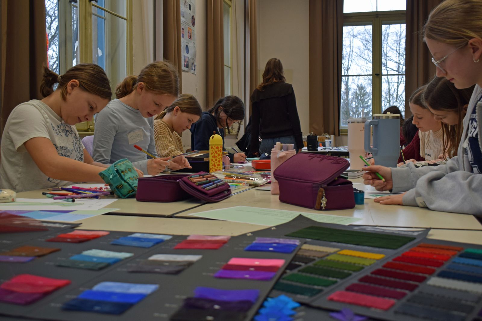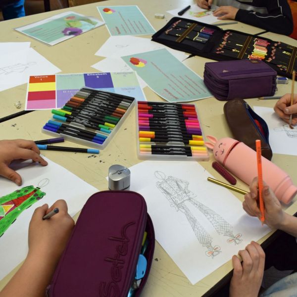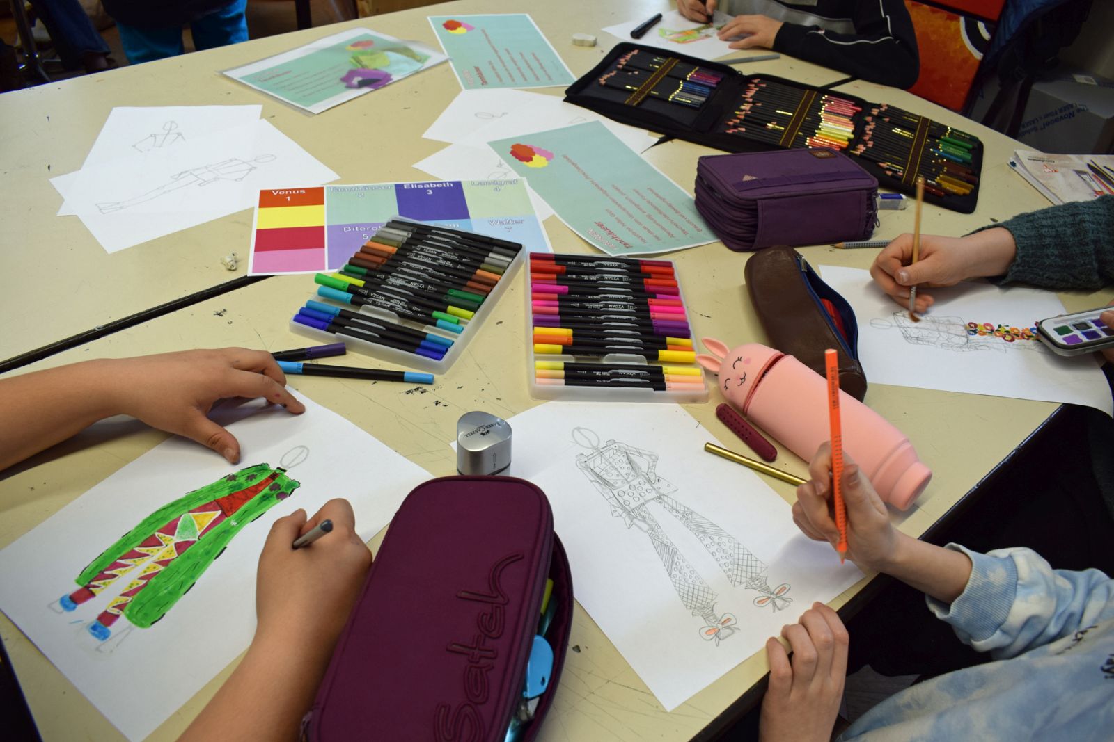 Nach einem Grußwort unserer Schulleiterin, Elisabeth Götz, stimmten zu Beginn des Workshops im Winter am MWG die Regisseurin Nada Zimmermann, die Dramaturgin Clara M. Richter sowie die Bühnenbildnerinnen Pauline Heitmann und Hannah Lucie Sammann zusammen mit Studierenden des Studiengangs Maskenbild die Kinder mit einem Farbkonzept und den besonderen Eigenschaften der Charaktere im Stück ein. So sollte die Hauptfigur Tannhäuser beispielsweise ein helles Grün tragen, weiche, fließende Formen erhalten und ein pink-orangefarbenes Mitbringsel vom Venusplaneten bekommen. Das Regieteam war von der Kreativität der Schülerinnen und Schüler sehr begeistert und hochzufrieden mit einer großen Auswahl an Entwürfen am Ende dieses Tages. Auch wenn nicht alle Kostüme umgesetzt werden konnten, beeinflussten sich die Kinder gegenseitig mit ihren Zeichnungen, sodass letztendlich ein Klassenkunstwerk entstand.