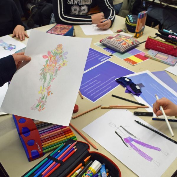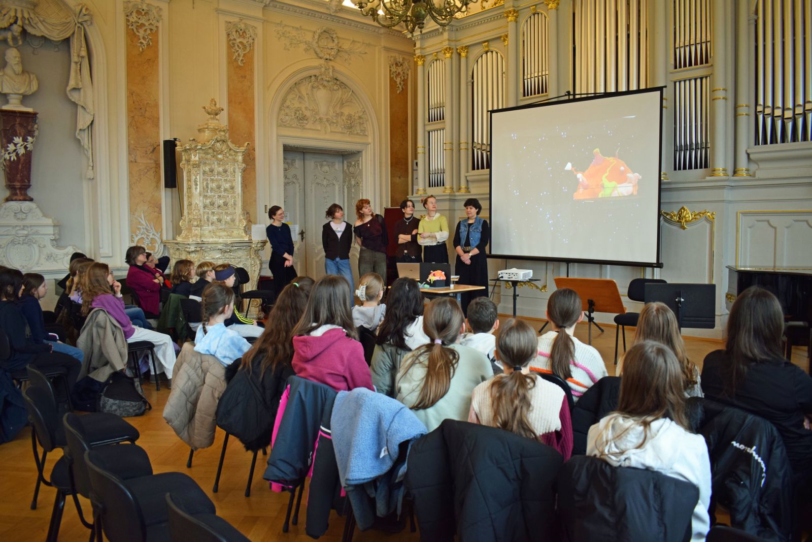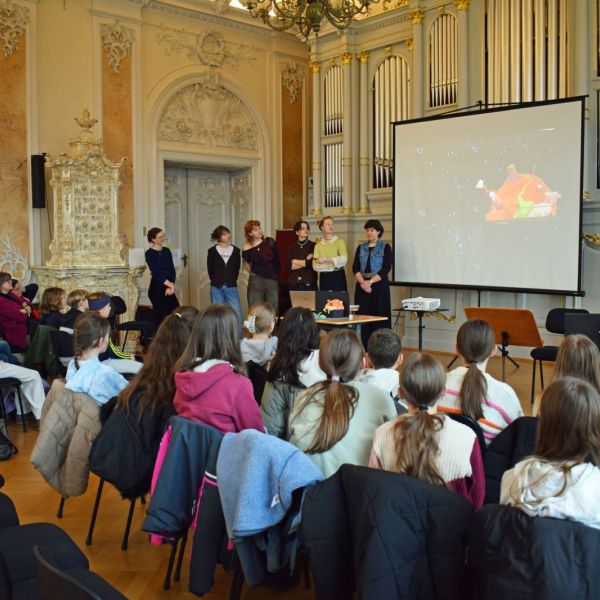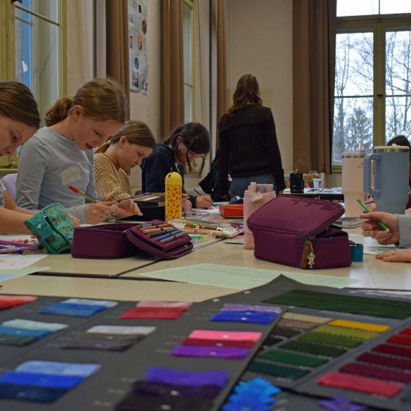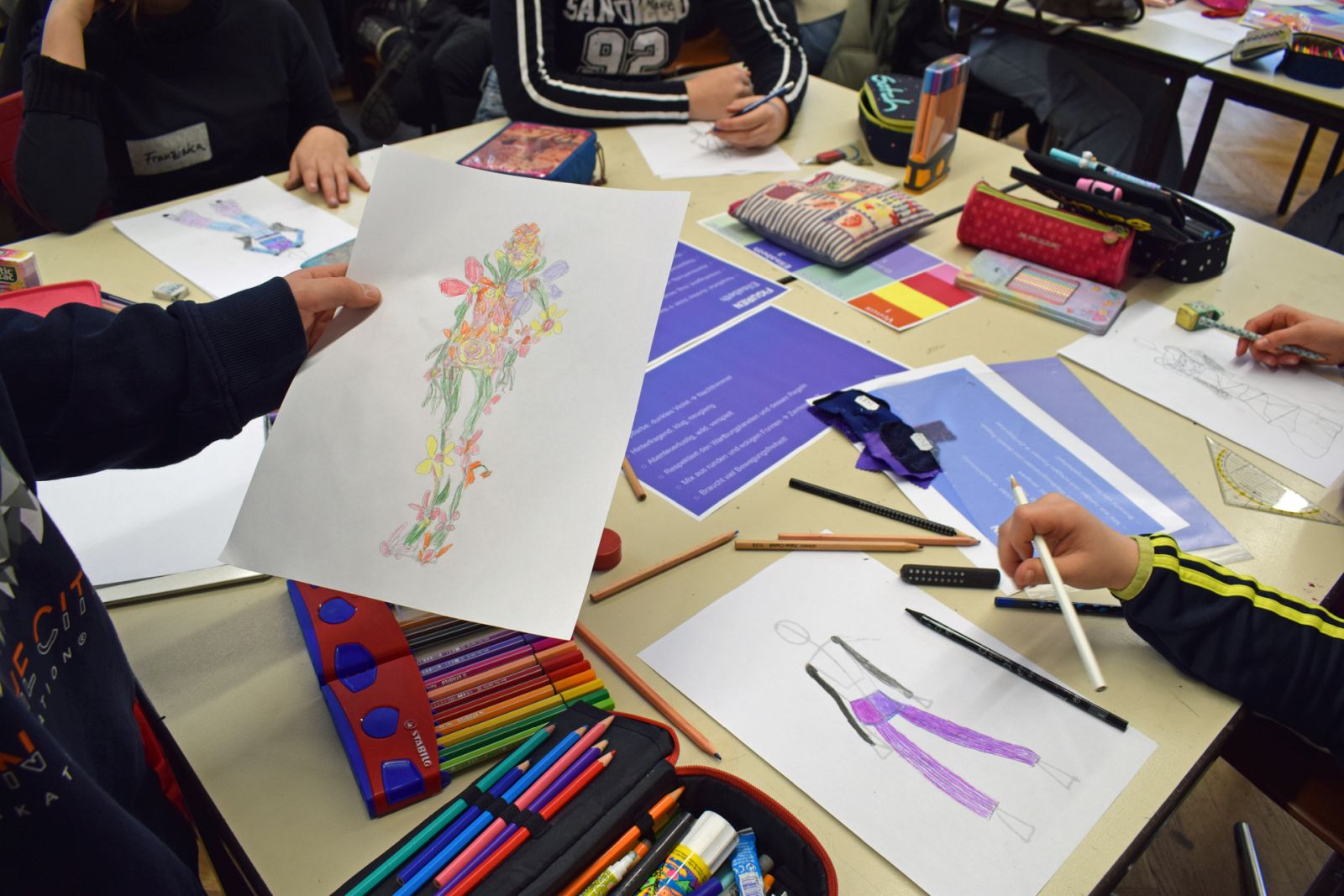 Nach einem Grußwort unserer Schulleiterin, Elisabeth Götz, stimmten zu Beginn des Workshops im Winter am MWG die Regisseurin Nada Zimmermann, die Dramaturgin Clara M. Richter sowie die Bühnenbildnerinnen Pauline Heitmann und Hannah Lucie Sammann zusammen mit Studierenden des Studiengangs Maskenbild die Kinder mit einem Farbkonzept und den besonderen Eigenschaften der Charaktere im Stück ein. So sollte die Hauptfigur Tannhäuser beispielsweise ein helles Grün tragen, weiche, fließende Formen erhalten und ein pink-orangefarbenes Mitbringsel vom Venusplaneten bekommen. Das Regieteam war von der Kreativität der Schülerinnen und Schüler sehr begeistert und hochzufrieden mit einer großen Auswahl an Entwürfen am Ende dieses Tages. Auch wenn nicht alle Kostüme umgesetzt werden konnten, beeinflussten sich die Kinder gegenseitig mit ihren Zeichnungen, sodass letztendlich ein Klassenkunstwerk entstand.