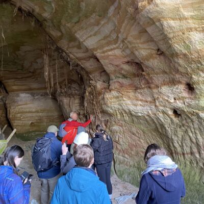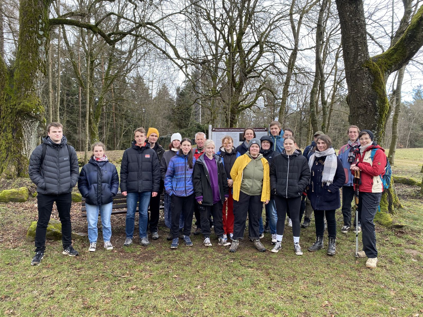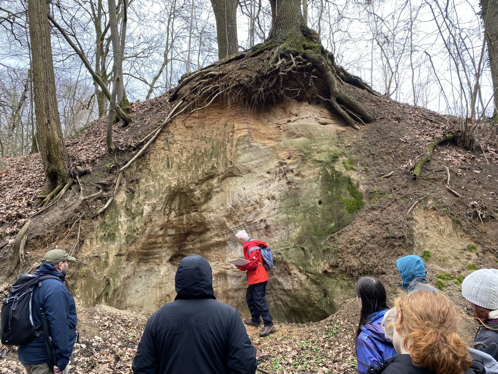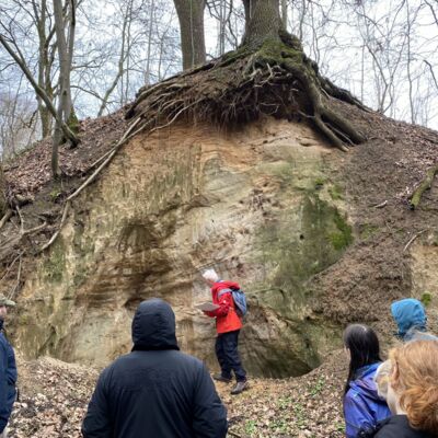 Dass sich Geograph:innen nicht durch das Wetter, besonders Regen und Wind, abschrecken lassen, bewies der Geologiekurs der Q12 Anfang März bei seiner Exkursion auf den Bayreuther „Hausberg“, den Sophienberg. Dabei erklärte unser geologischer Führer Richard Regner vom Geopark Bayern-Böhmen die Entstehung des Sophienbergs: Die Ablagerungen gehen auf eine Zeit bis vor ca. 200 Millionen Jahren zurück, als sich die Gegend um Bayreuth noch im Delta eines Flusses befand, der in ein tropisches Meer mündete, von der Größe vergleichbar mit dem heutigen Mississippidelta. Beim Wandern bergauf wurden die einzelnen Schichten anhand der unterschiedlichen Gesteine, Böden und deren Nutzung direkt sichtbar. Dass widerstandsfähige Gesteine wie der Eisensandstein einen steileren Hang bilden, wird wohl kaum jemand mehr vergessen, der diesen selbst hochgestiegen ist! Bemerkenswert ist, dass die ursprünglichen Schichten an vielen Stellen schon abgetragen wurden, nur der Sophienberg, wie auch die Neubürg, das Walberla und andere Zeugenberge, sind noch stehen geblieben und lassen uns einen Blick in die Erdgeschichte werfen.