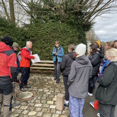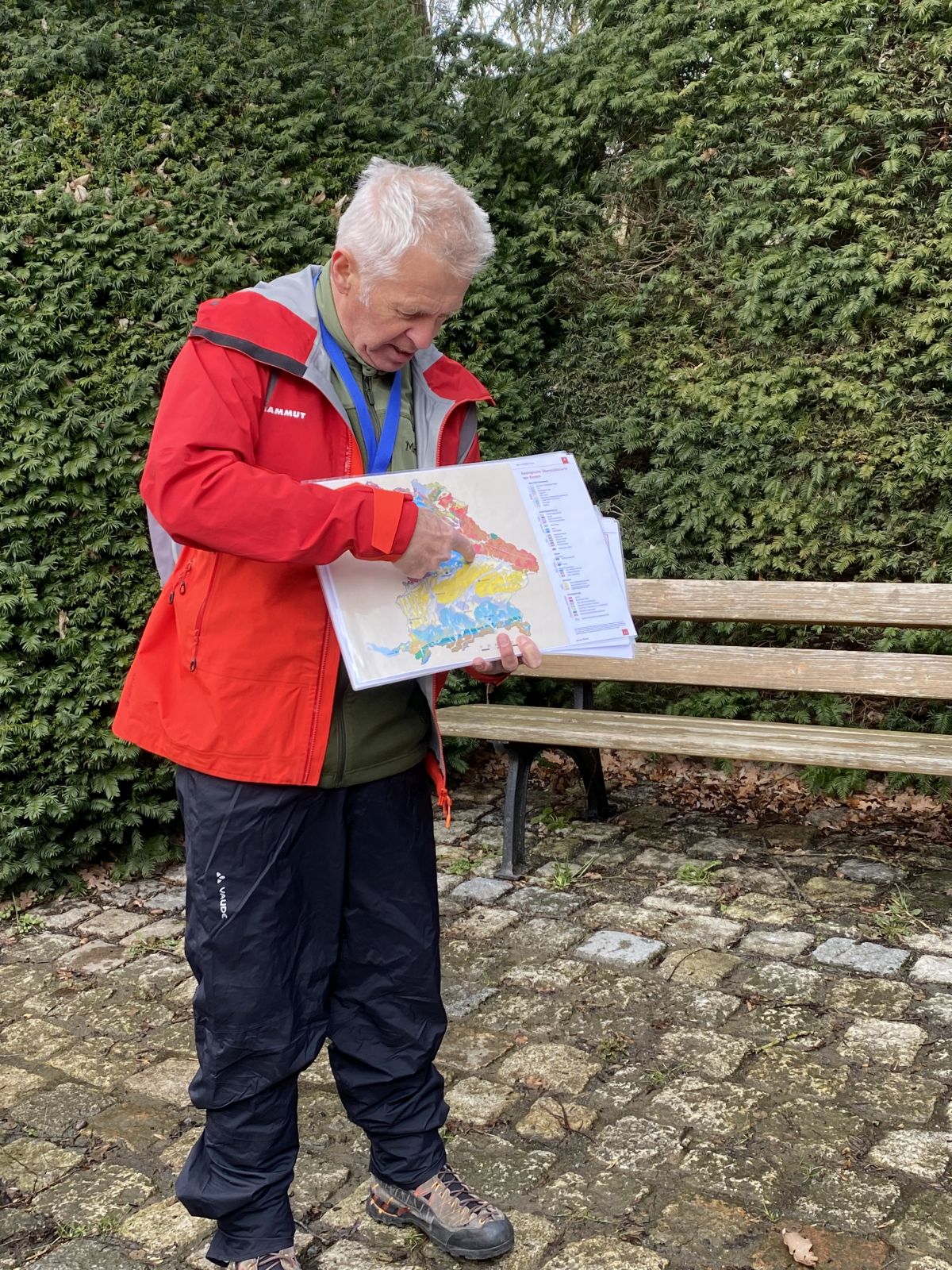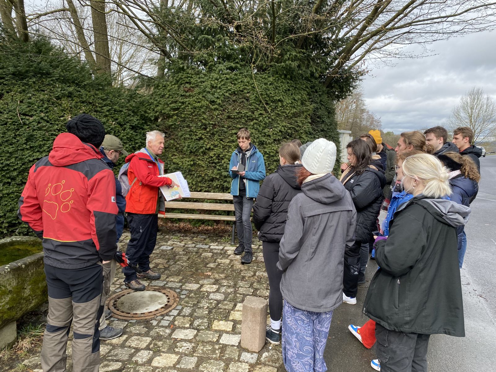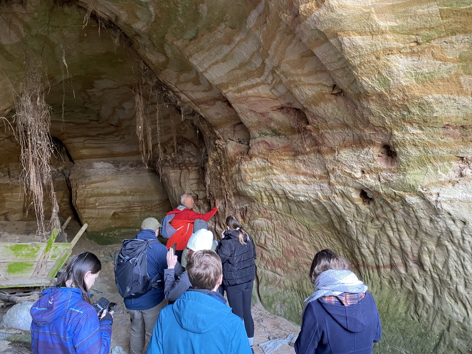 Dass sich Geograph:innen nicht durch das Wetter, besonders Regen und Wind, abschrecken lassen, bewies der Geologiekurs der Q12 Anfang März bei seiner Exkursion auf den Bayreuther „Hausberg“, den Sophienberg. Dabei erklärte unser geologischer Führer Richard Regner vom Geopark Bayern-Böhmen die Entstehung des Sophienbergs: Die Ablagerungen gehen auf eine Zeit bis vor ca. 200 Millionen Jahren zurück, als sich die Gegend um Bayreuth noch im Delta eines Flusses befand, der in ein tropisches Meer mündete, von der Größe vergleichbar mit dem heutigen Mississippidelta. Beim Wandern bergauf wurden die einzelnen Schichten anhand der unterschiedlichen Gesteine, Böden und deren Nutzung direkt sichtbar. Dass widerstandsfähige Gesteine wie der Eisensandstein einen steileren Hang bilden, wird wohl kaum jemand mehr vergessen, der diesen selbst hochgestiegen ist! Bemerkenswert ist, dass die ursprünglichen Schichten an vielen Stellen schon abgetragen wurden, nur der Sophienberg, wie auch die Neubürg, das Walberla und andere Zeugenberge, sind noch stehen geblieben und lassen uns einen Blick in die Erdgeschichte werfen.