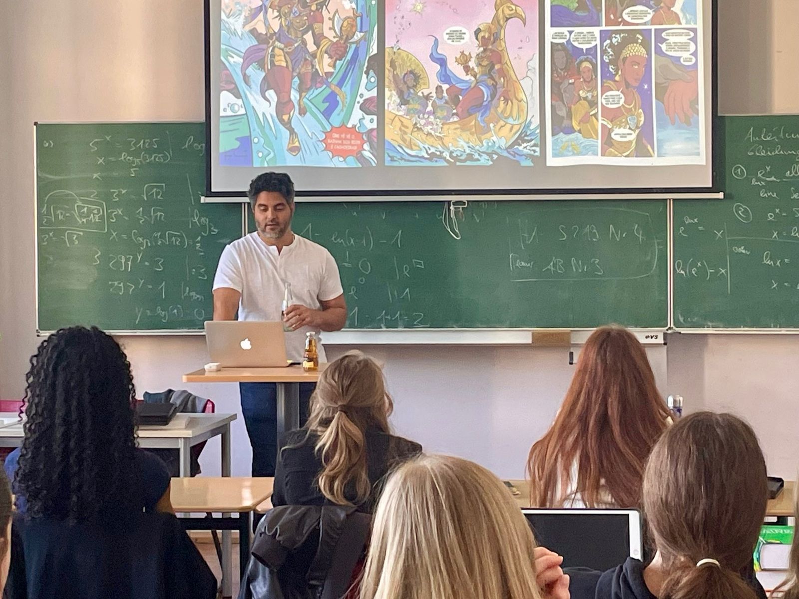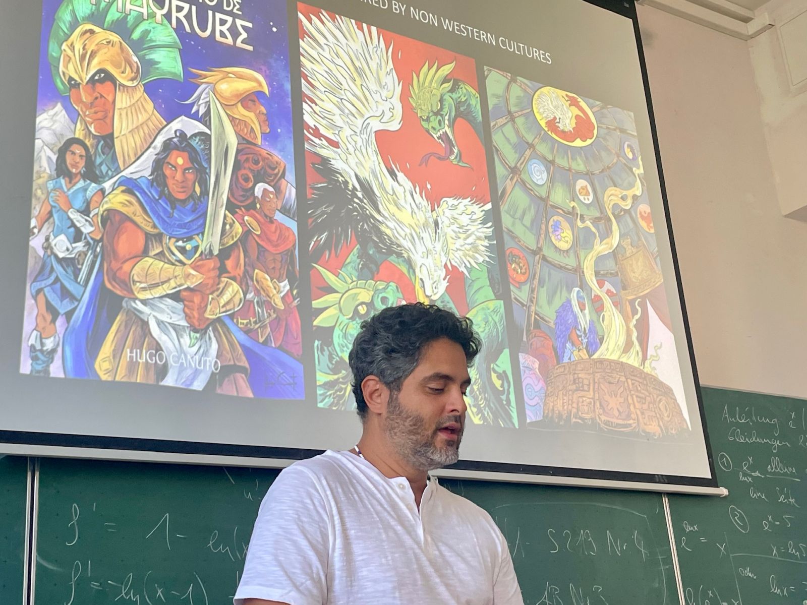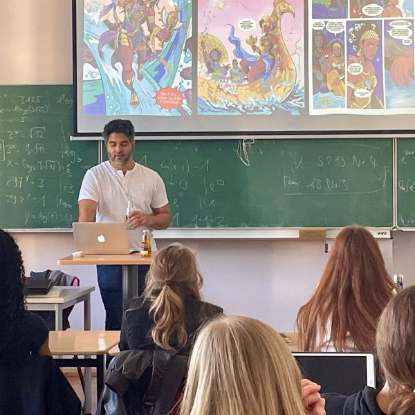 Der brasilianische Comiczeichner Hugo Canuto, der mit seinen Arbeiten international bekannt wurde und regelmäßig zu Vorträgen und Workshops in Nord- und Südamerika sowie in Europa eingeladen wird, war zu Besuch am Markgräfin-Wilhelmine-Gymnasium. Im Rahmen eines Vortrags und Workshops stellte er seinen künstlerischen Ansatz vor: In seinen Graphic Novels beschäftigt sich Canuto mit afro-brasilianischen spirituellen und religiösen Traditionen. Grundlage seiner Arbeit sind sorgfältige Recherchen, die er in eine bildnerisch wie erzählerisch dichte Form übersetzt. Im Gespräch mit den Schülerinnen und Schülern erläuterte er seinen gestalterischen Prozess, sprach über inhaltliche Hintergründe und beantwortete praktische Fragen zur Umsetzung eigener Comicprojekte. Dabei gab er auch Hinweise zur Verbindung von Recherche, Erzählstruktur und Bildgestaltung.
