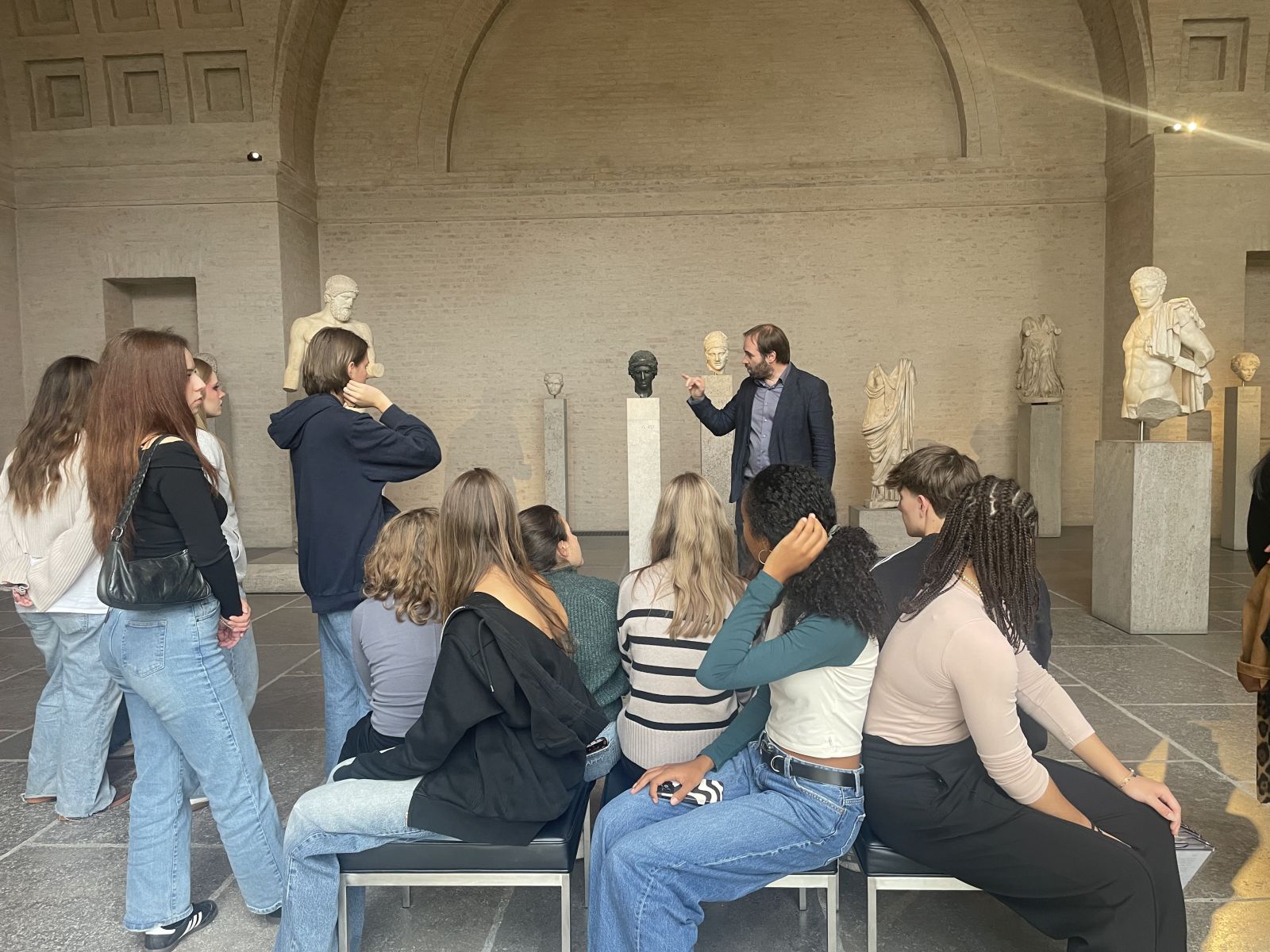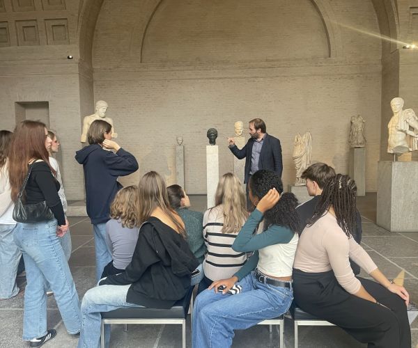 Nach der Ankunft und dem schnellen Abstellen des Gepäcks führte uns der erste Weg in die Glyptothek, eines der ältesten Museen Münchens. Dort erfuhren wir, wie antike Skulpturen durch Haltung, Mimik, Größe und Materialbestimmte Botschaften vermitteln. Besonders spannend war zu sehen, wie bewusst Künstler schon damals mit Ausdruck und Wirkung spielten. Zum Abschluss durften wir selbst kreativ werden und eine Figur zeichnen – mit sehr individuellen Ergebnissen, aber viel Begeisterung.