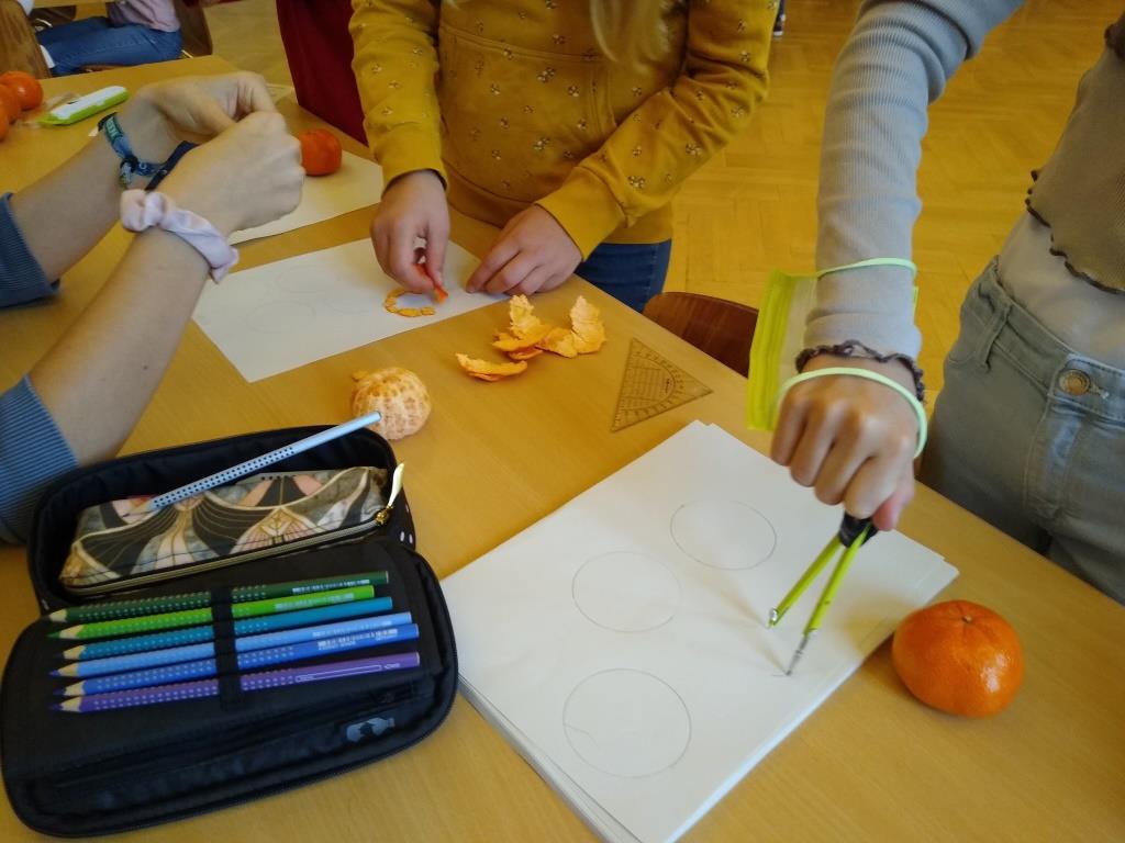 Eine weitere geometrische Formel erschlossen sie sich durch Mandarinenschalen. Mithilfe von Zirkel und Messschieber wurden Kreise gezeichnet und insgesamt vier davon mit der Schale einer Mandarine ausgelegt. Fügt man noch ein bisschen Wissen aus der 8. Klasse hinzu, ergibt sich die Oberflächenformel für die Kugel.