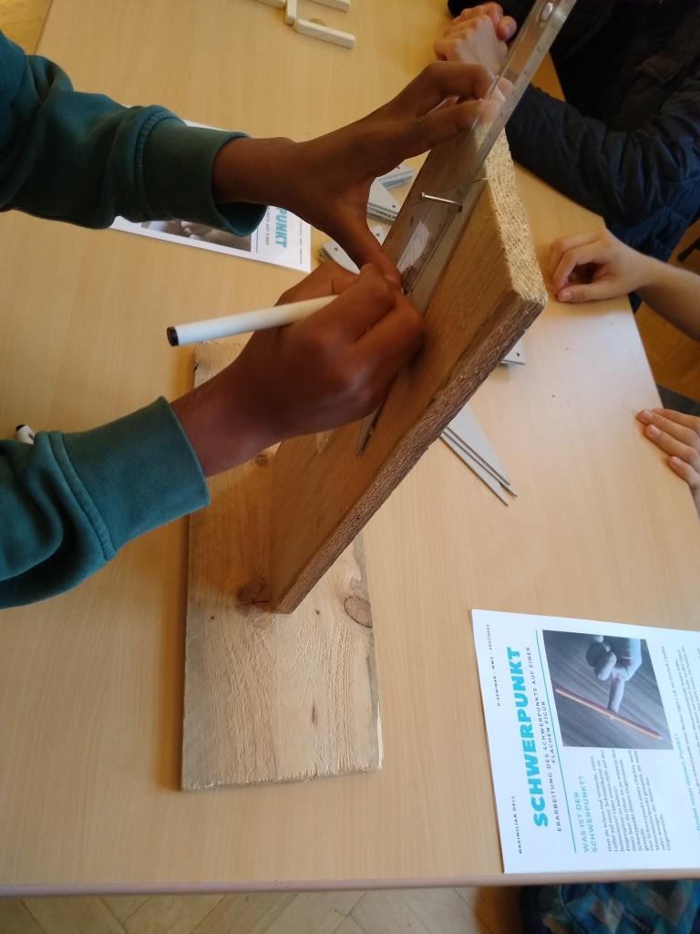 Geometrisch wurde es auch beim zeichnerischen Bestimmen des Schwerpunktes von zweidimensionalen Figuren mit Hilfe eines Holzgerüstes, das extra entwickelt wurde. Durch einfaches Zeichnen und Verbinden von Linien bekamen die Schülerinnen und Schüler einen kleinen Eindruck von dem, was sie in naher Zukunft im Mathematikunterricht erwartet.