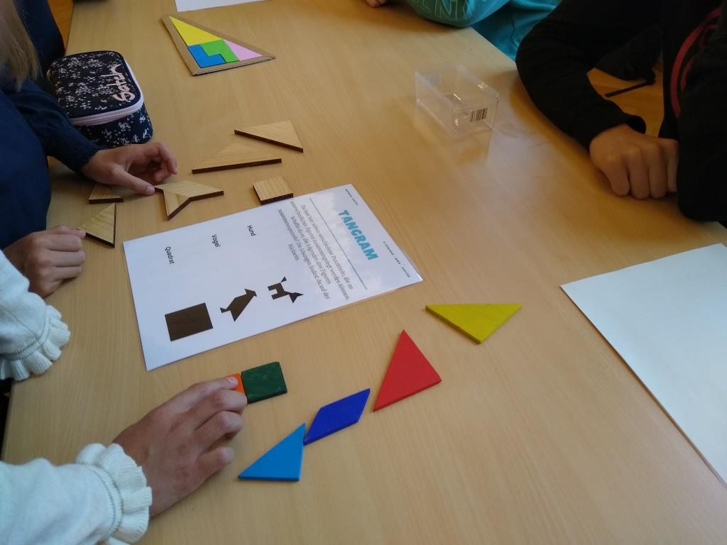 Natürlich kamen auch die Knobel-Fans nicht zu kurz. Ob beim Tangrampuzzle (Legen von großen geometrischen Figuren aus verschiedenen kleinen), beim Befreien einer Münze aus einem aus Holstäbchen gelegten Kelch, ohne dessen Form zu verlieren und ohne die Münze dabei zu bewegen, oder beim Bau eines Würfels aus kleineren Würfeln.