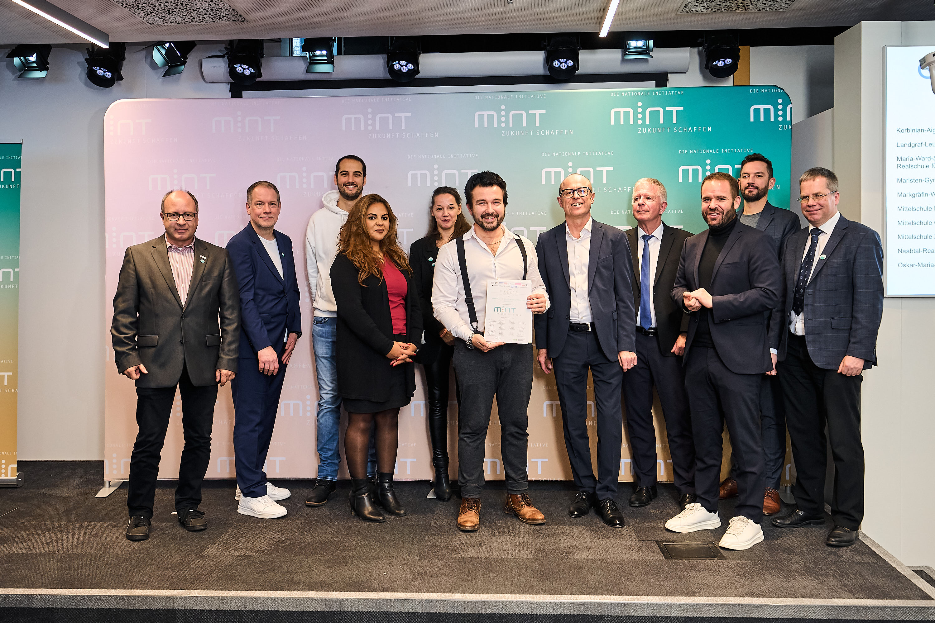 V.l.n.r.: Andreas Gollasch (BWI GmbH); Christian Fischer (MINT Zukunft e.V.); Dr. Wieland Holfelder (Google); Shiva Alemi (Dr.-Ing. Paul Christiani GmbH & Co. KG); Katja Rasch (Deutsche Bahn); Johannes Monsch (MINT-Beauftragter am MWG); Dr. Christof Prechtl (vbw – Vereinigung der Bayerischen Wirtschaft e. V.); Ministerialdirigent Dr. Wolfgang Mutter vom Bayerischen Kultusministerium; Bernhard Eberl (PTC); Julian Marberger (VDE); Andreas Mettenleiter (Mekruphy). © Fabian Vogl (fabianvogl.com)