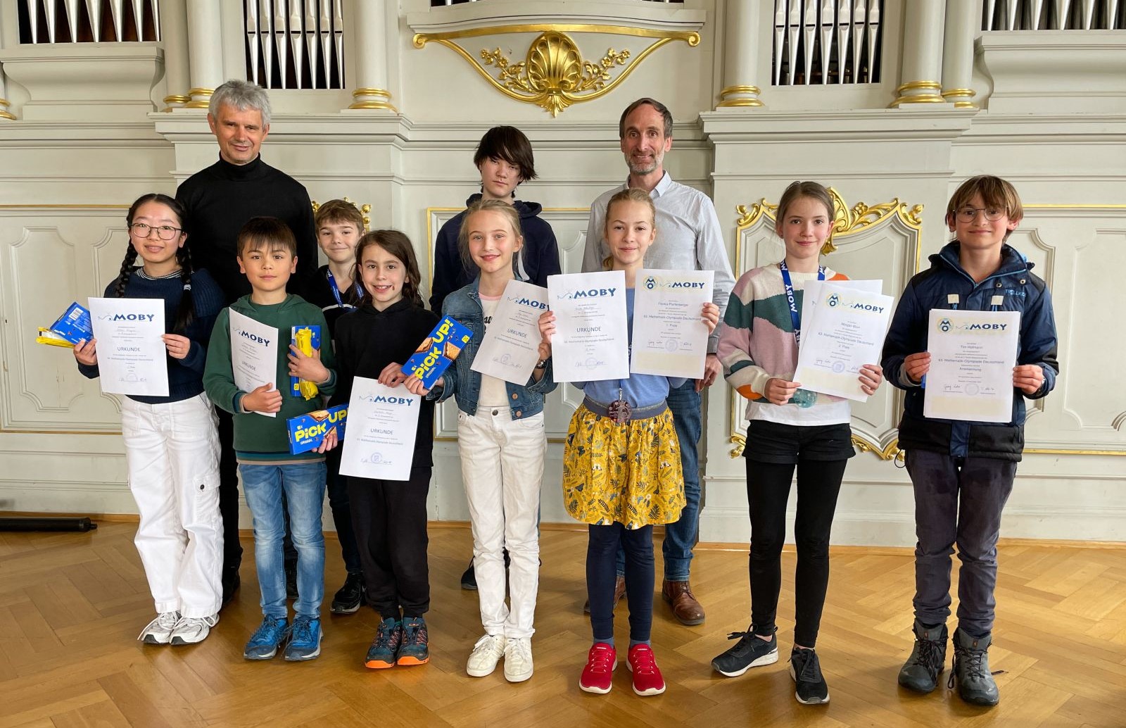 Besonders hervorzuheben sind hier drei Schülerinnen und Schüler aus der 5. und 6. Jahrgangsstufe: Sowohl Franka Pfaffenberger (5b) als auch Morgan Blum (5d) und Jakob Weber (6d) kamen bei der Landesrunde unter die zwölf Preisträgerinnen und Preisträger des Tages. Franka und Jakob erlangten jeweils einen tollen 3. Preis und hatten damit in ihrer Alterskategorie nur drei bzw. zwei andere Teilnehmerinnen und Teilnehmer vor sich. Morgan erreichte sogar einen hervorragenden 2. Preis und wurde im Wettbewerb der 5. Klassen damit Zweitplatzierte. Da Johannes Schafföner (5d) am gleichen Tag für das MWG mit Jugend forscht unterwegs war, konnte er leider an der Moby-Landesrunde nicht teilnehmen. Für die jüngere Altersklasse endete der Wettbewerb mit der Landesrunde.