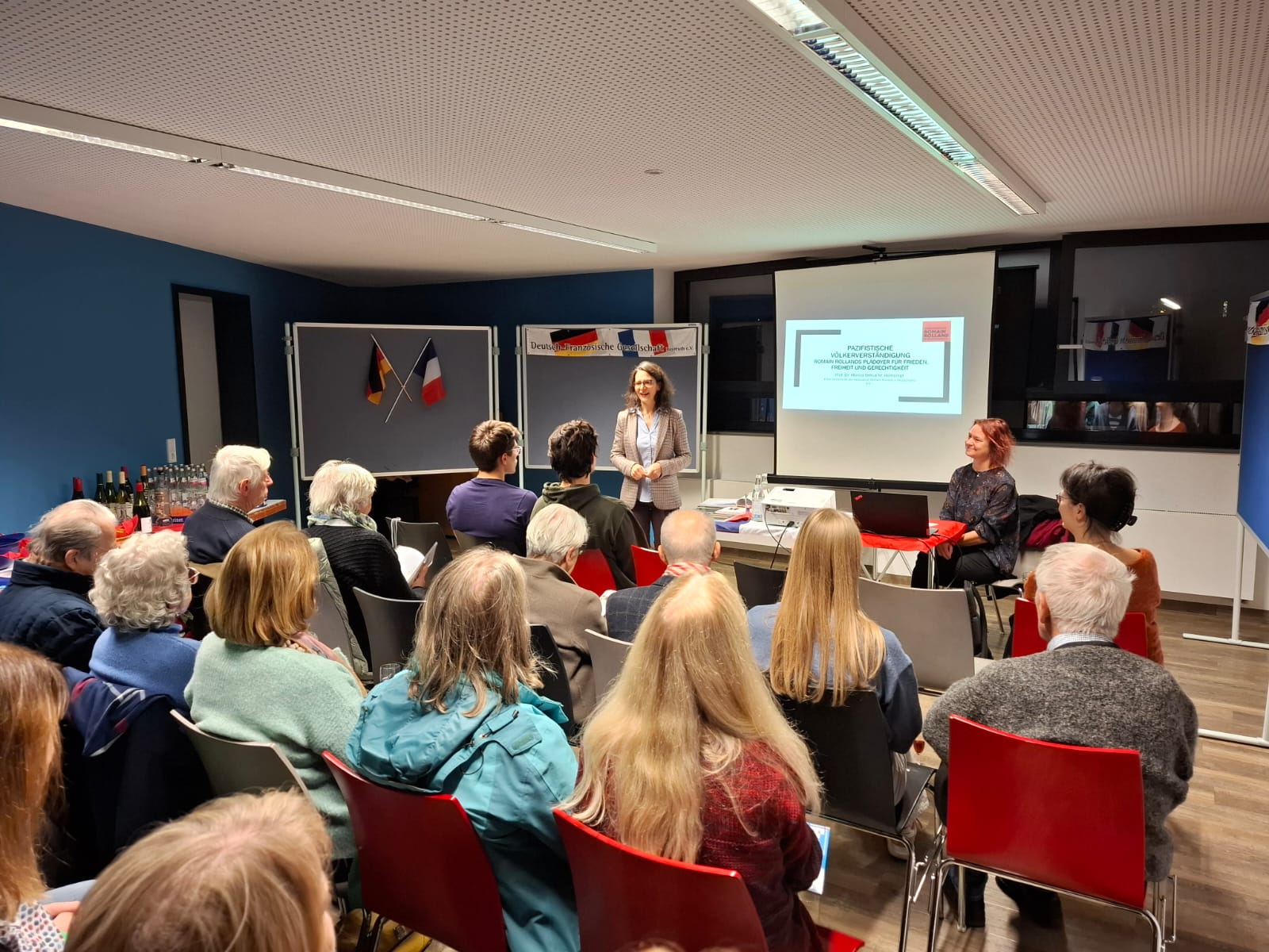 Das W-Seminar „Frieden machen?“, das selbstredend auch mit den deutsch-französischen Beziehungen befasst, konnte sich im Rahmen eines spannenden Vortrags am 07. November 2024 vertieft mit der Gedankenwelt Rollands auseinandersetzen. Die Deutsch-Französische Gesellschaft hatte die renommierte Romanistin Frau Prof. Marina Ortrud Hertrampf von der Universität Passau für einen Abend über Romain Rolland gewinnen können. Die Referentin ist zudem Erste Vorsitzende der Association Romain Rolland in Deutschland e.V., daher also eine ausgewiesene Expertin für das Werk eines der Vordenker der deutsch-französischen Freundschaft und auch der europäischen Integration.