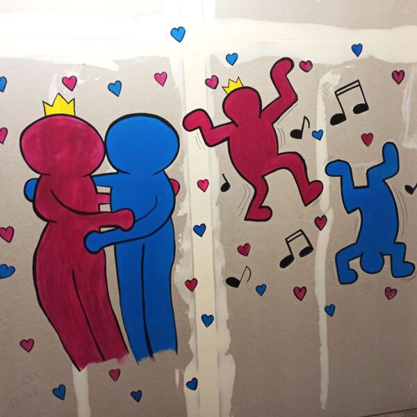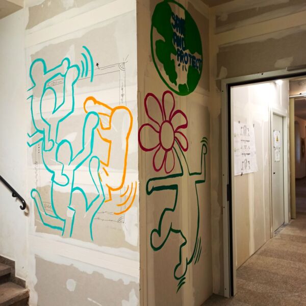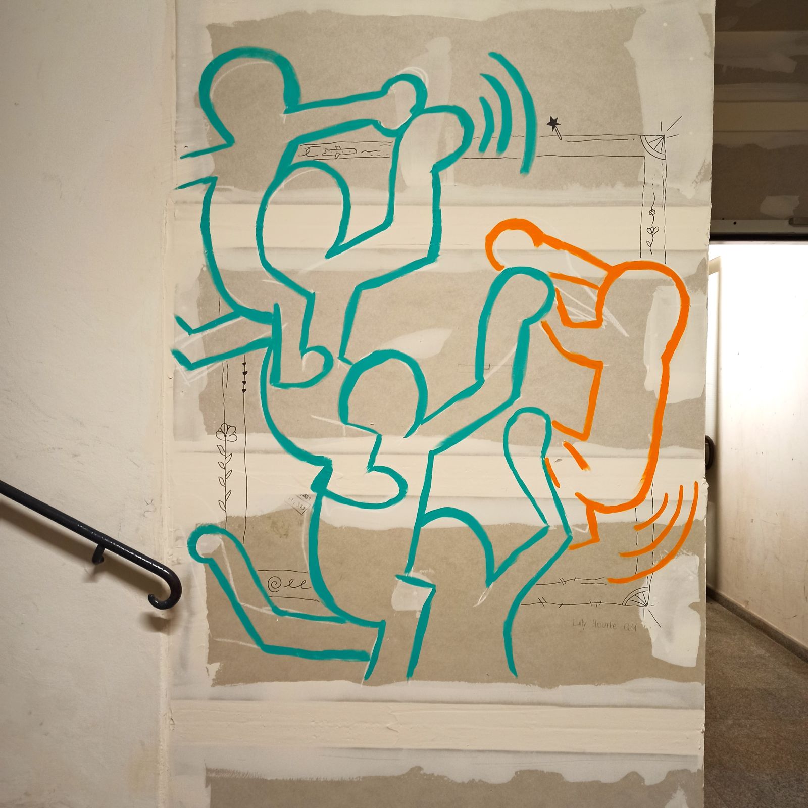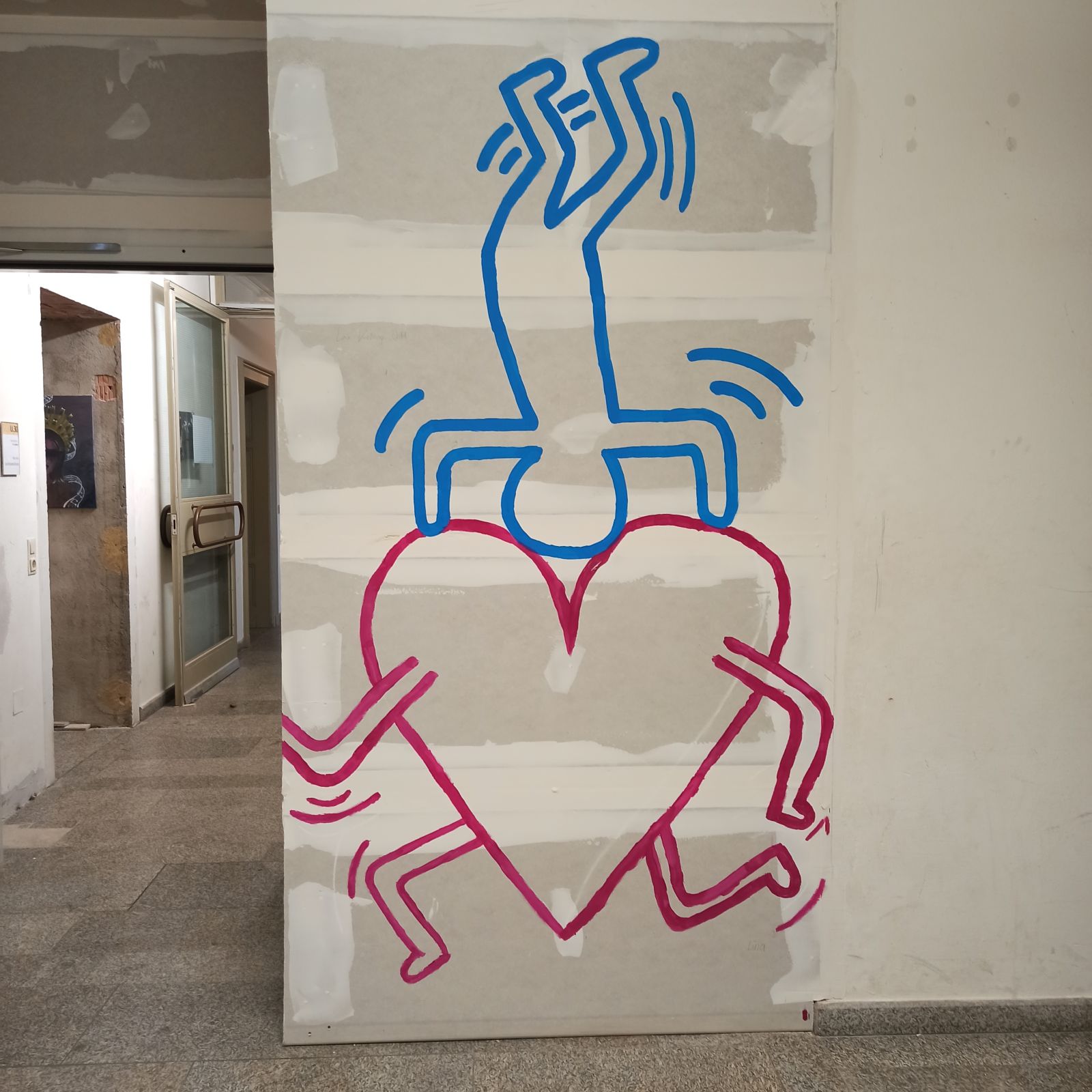 SchülerInnen der 11. Jahrgangsstufe haben sich die Lebensfreude und auch Kritik der Arbeiten des Künstlers Keith Haring angenommen und ihre eignen kleinen Botschaften visualisiert. An den Baustellenwänden im Sockelgeschoss unseres MWGs könnt ihr sie entschlüsseln!