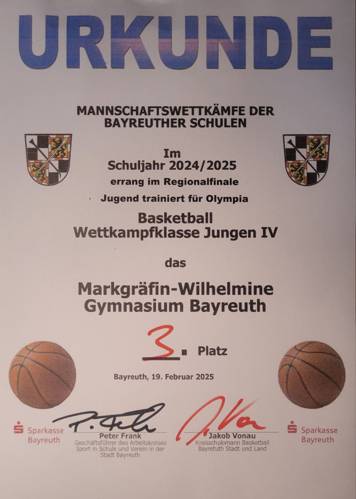 Am Mittwoch, 19.02.25, durfte unsere MWG-Basketballmannschaft in der Wettkampfklasse IV (U13) am Basketball-Regionalfinale teilnehmen. Nach zwei knappen Niederlagen gegen das WWG und das GMG erreichte unser Team schließlich dank hoher Motivation und guter Mannschaftsleistung mit einem deutlichen Sieg gegen das CVG Kulmbach einen guten 3. Platz. In einem spannenden Finale konnte sich das GMG gegen das WWG durchsetzen. Wir gratulieren, wünschen viel Erfolg beim weiteren Turnierverlauf und freuen uns auf spannende Spiele im nächsten Schuljahr.
