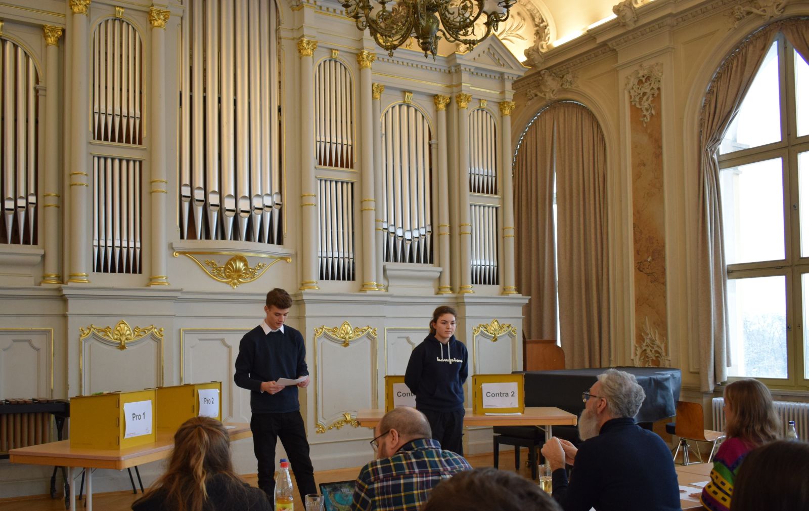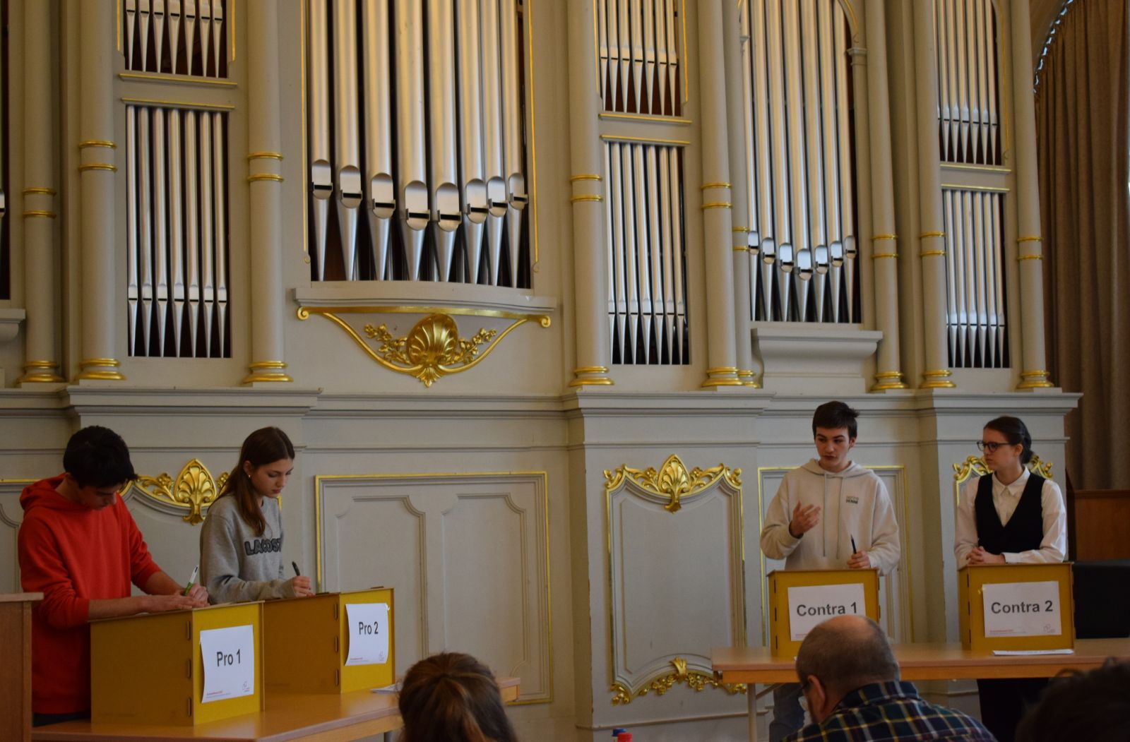 Im Folgenden erklärten Louis Bruchmann und Julius Haendle, die durch die Veranstaltung führten, den Ablauf einer Debatte und stellten die Finalisten mitsamt dem Thema vor. Diese stiegen direkt in ihr Duell ein und boten dem Publikum eine professionelle und kompetente Debatte, die zum Nachdenken und zur Auseinandersetzung mit der Streitfrage anregte. Die Schwierigkeit beim Küren eines Siegers äußerte sich nicht nur durch den kompetitiven Charakter der Debatte, sondern auch durch die außergewöhnlich lang andauernde Beratungszeit, die die Jury benötigte, um die Platzierungen auszumachen. Schlussendlich erreichte Justus Gallert den ersten, Franziska Lang den zweiten, Laura Finke den dritten und Johannes Haendle den vierten Platz. Somit werden Justus und Franziska das MWG beim Regionalentscheid am 15. Februar in Münnerstadt repräsentieren.