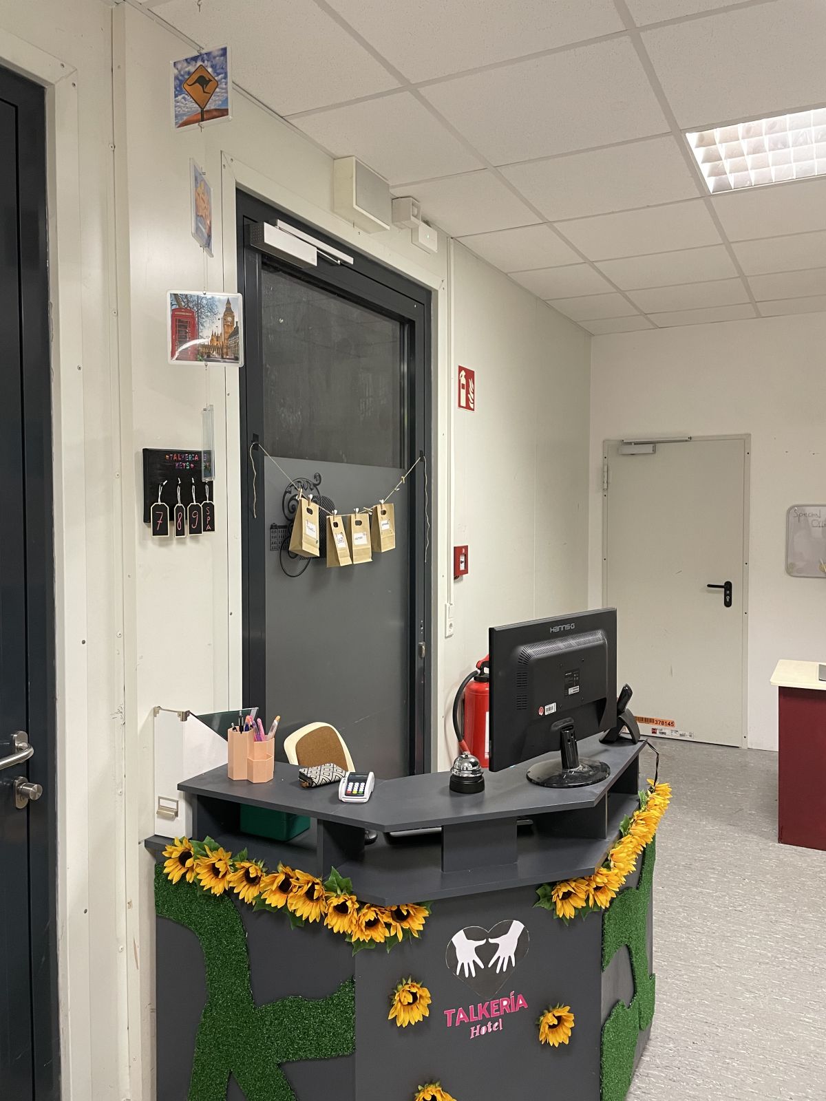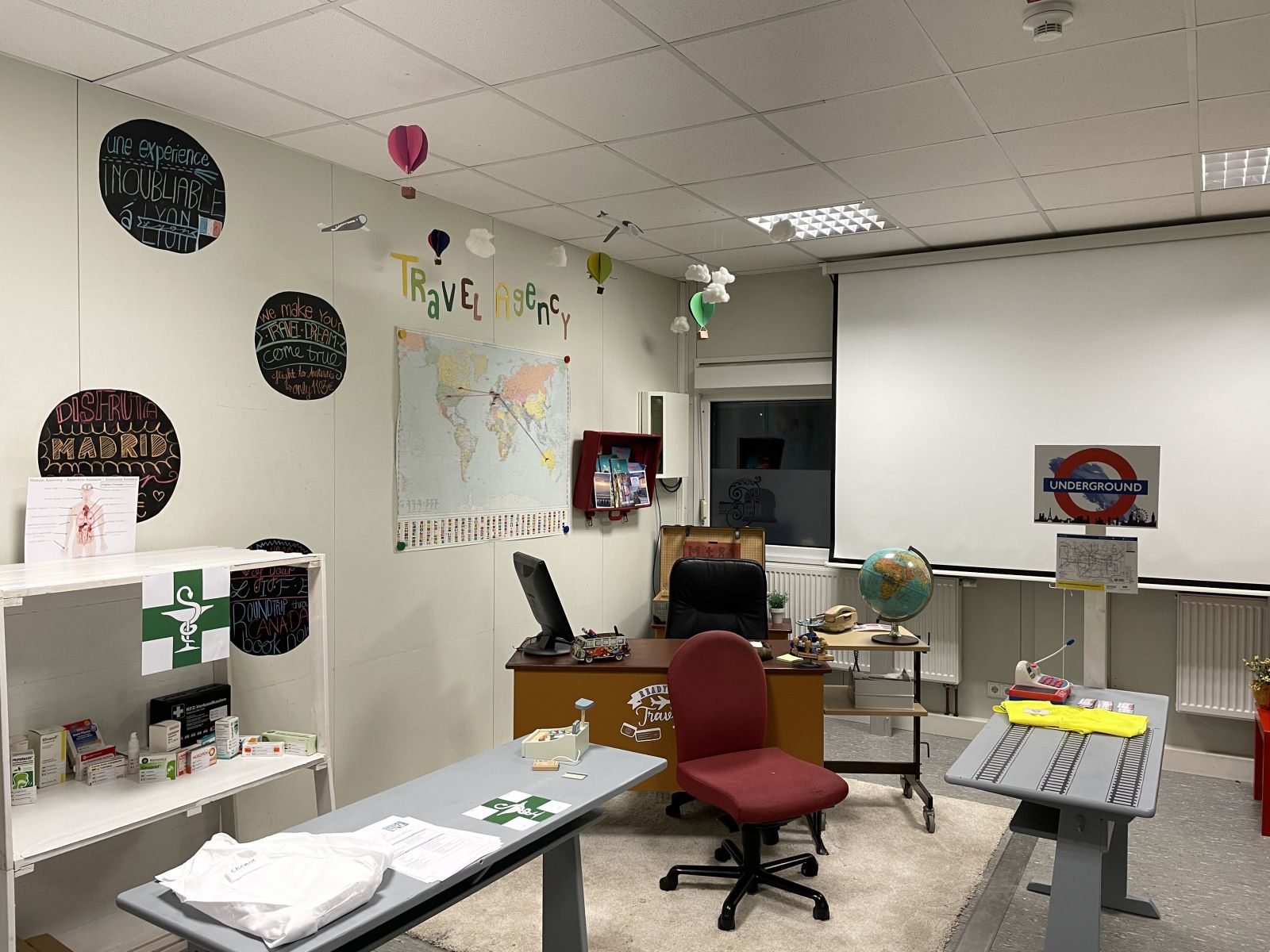 In diesem Zimmer im Pavillon kann ab jetzt auf Französisch, Spanisch und Englisch eingekauft, eine Reise gebucht, im Hotel eingecheckt, eine Fernsehshow erstellt und eine Sightseeingtour gemacht werden. Alle Requisiten und Kulissen stehen bereit und warten auf euch!
