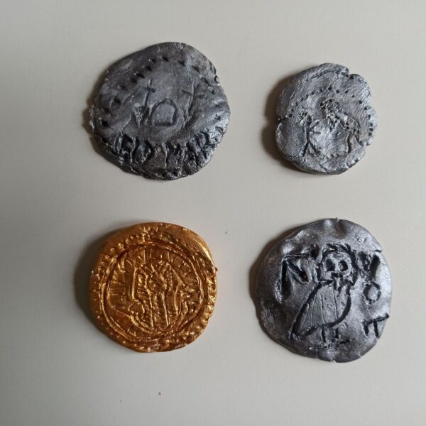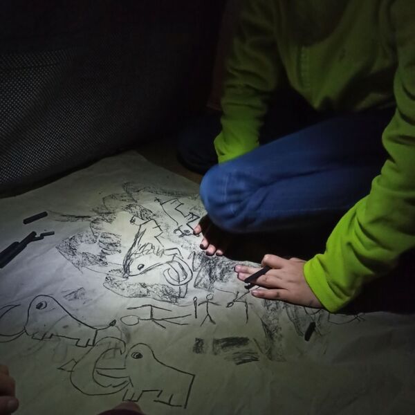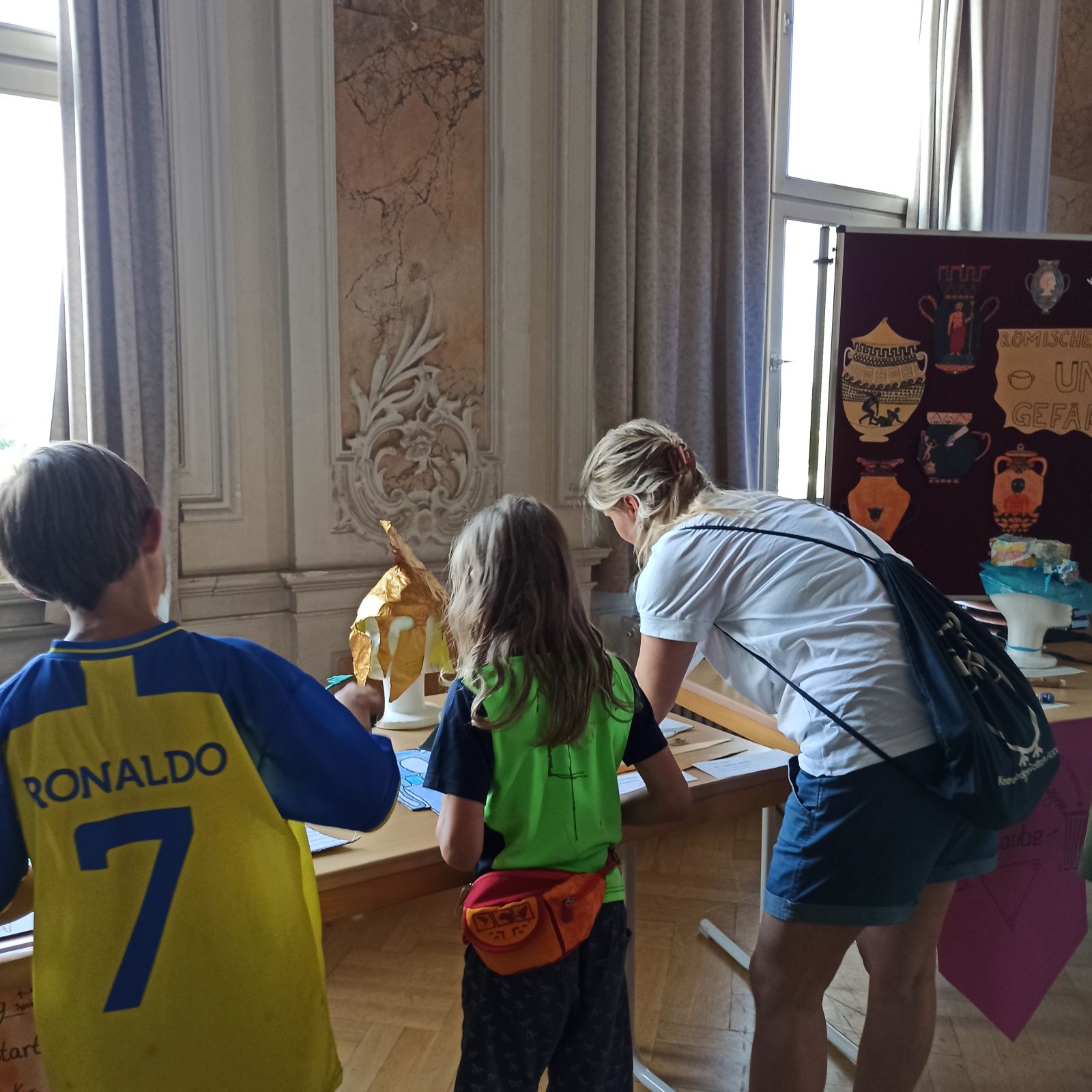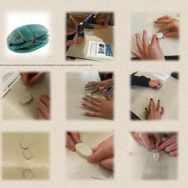 Innerhalb des Projektes gab es zum einen kleine vertiefende Unterrichtseinheiten mit der ganzen Klasse, wie z.B. die Doppelstunde zur Höhlenmalerei, in der die Kinder selbst gemeinsam die Erfahrung machen durften bei wenig Licht auf unebenem Grund in ihrer Deckenhöhle mit Kohle zu zeichnen. Im Winter war die Klasse eifrig am Werk bei der Herstellung eines ägyptischen Skarabäus als Glücksbringer, im Frühling fühlten wir nach wie man sich zu Zeiten des antiken Roms kleidete und versetzten uns mittels Greenscreen in eine römische Kulisse. Zu jeder Zeitphase gab es ein bis zwei Erlebnisse.