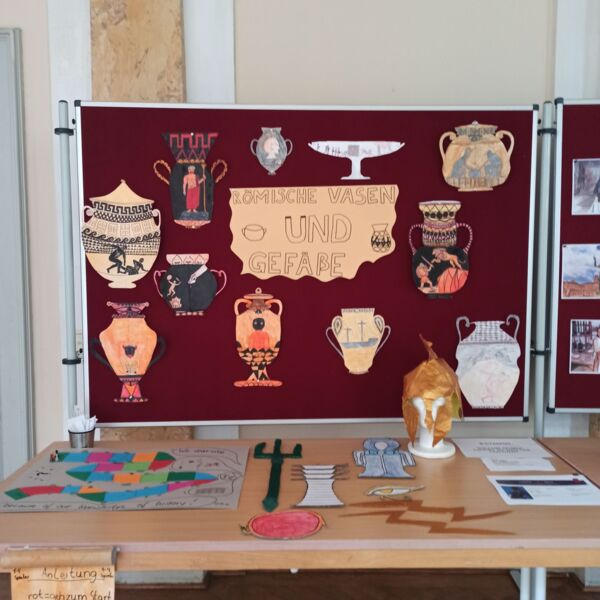 In Einzel- bzw. Kleingruppenarbeit arbeiteten die Schüler*innen andererseits über das ganze Schuljahr hinweg begleitend selbständig. Dabei steht die Auseinandersetzung mit einem speziell ausgewählten Bereich z. B. Wohnen im Zentrum, der von der Steinzeit bis zur Zeit Roms vergleichend erarbeitet und auch per Präsentationen reflektiert wurde. Dies fand sowohl zu Hause in eigener Organisation als auch in der Schule statt. Die Schüler*innen befassten sich mit den Themenbereichen: Nahrung/Werkzeuge/Aufbewahrung, Kleidung, Wohnen, Politische Ordnung/Wirtschaft, Glaube/Religion/Kunst und soziales Zusammensein/Familie. Dabei wurden Objekte, z.B. ein steinzeitlicher Speer, hergestellt oder Schuhe dieser frühen Zeit angefertigt. Außerdem Gerichte aus der Jungsteinzeit und der Antike ausprobiert, Vasen getöpfert, Hausmodelle nachgebaut oder die Symbole der Götter erforscht, die wir heute noch kennen.