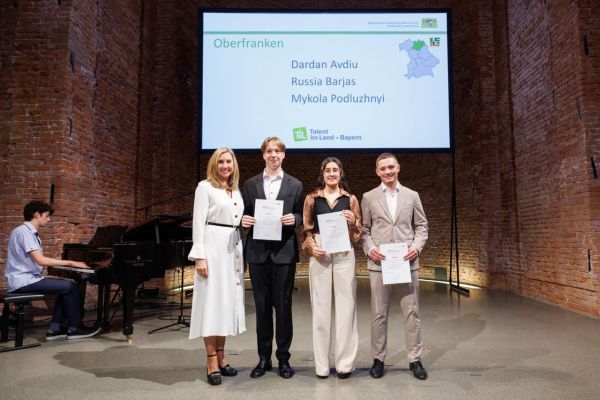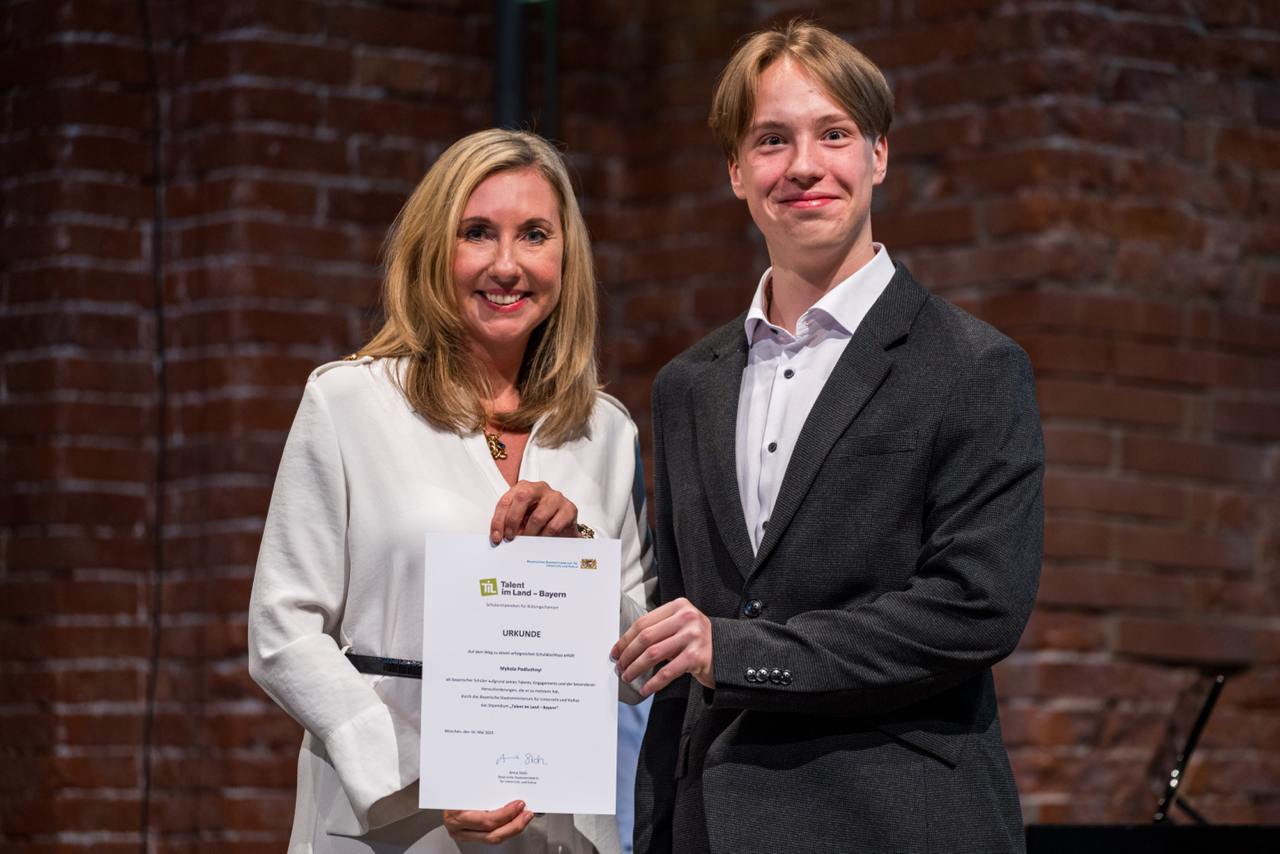 Wir freuen uns sehr, dass unser Schüler Mykola Podluzhnyi in das Programm „Talent im Land“ aufgenommen wurde. Bei einem feierlichen Festakt am 16.05.2025 verlieh ihm die Bayerische Staatsministerin für Unterricht und Kultus, Frau Anna Stolz, seine Urkunde. Mykola gehört jetzt zu den 35 Stipendiaten und Stipendiatinnen, die ein mehrstufiges Bewerbungsverfahren durchlaufen haben und bis zum Abitur eine monatliche Förderung und individuelle Unterstützung bei ihrer Laufbahn erhalten. Diese individuelle Beratung und Begleitung bei der Entdeckung der Talente und Fähigkeiten der Schüler und Schülerinnen sind wichtige Bausteine bei dem Programm „Talent im Land“. Mykola erhält aufgrund seiner guten schulischen Leistungen, seiner hohen Motivation und Leistungsbereitschaft und der großen Begabung für Naturwissenschaften dieses Stipendium, das faire Bildungschancen auch den jungen Menschen sichern soll, die aufgrund familiärer oder persönlicher Belastungen Hürden auf dem Weg zum Abitur überwinden müssen. Mykola interessiert sich besonders für Informatik, speziell für Blockchain, wofür er im Rahmen von „Jugend forscht“ arbeitet. Außerdem ist er in der deutsch-französischen Gesellschaft aktiv.