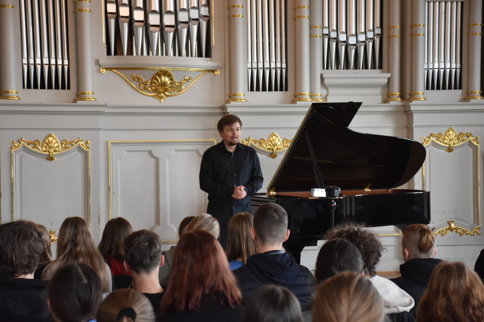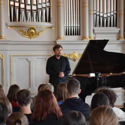 Eine Höhle der Löwen war unsere Aula am 18.10.2023, genauer: der Tastenlöwen. Als solche bezeichnen sich die Teilnehmer des internationalen Klavierfestivals „Les amateurs virtuoses“, das vom 19. bis zum 22.10.2023 in Bayreuth stattfand. Bevor es am Donnerstag in der Villa Wahnfried öffentlich losging, bekamen unsere Klavierschülerinnen und -schüler und ihre Lehrkräfte einen Vorgeschmack im Rahmen eines exklusiven Konzerts am MWG. Frau Götz begrüßte die Anwesenden und insbesondere den Organisator des Festivals, Julien Kurtz aus Pegnitz, sowie Mikhail Dubov aus London. Die beiden spielten sodann vor einem hochinteressierten und stark beeindruckten Publikum Werke von Nikolai Medtner, Peter Tschaikowsky und Nikolai Kapustin sowie die Fantasie in f-Moll von Franz Schubert. Steffen Arzberger, der das Konzert vermittelt hatte, dankte den beiden Pianisten schließlich für ihr Spiel und die zehn Freikarten für das Schlusskonzert im Markgräflichen Opernhaus, die an MWG-Schüler vergeben wurden.