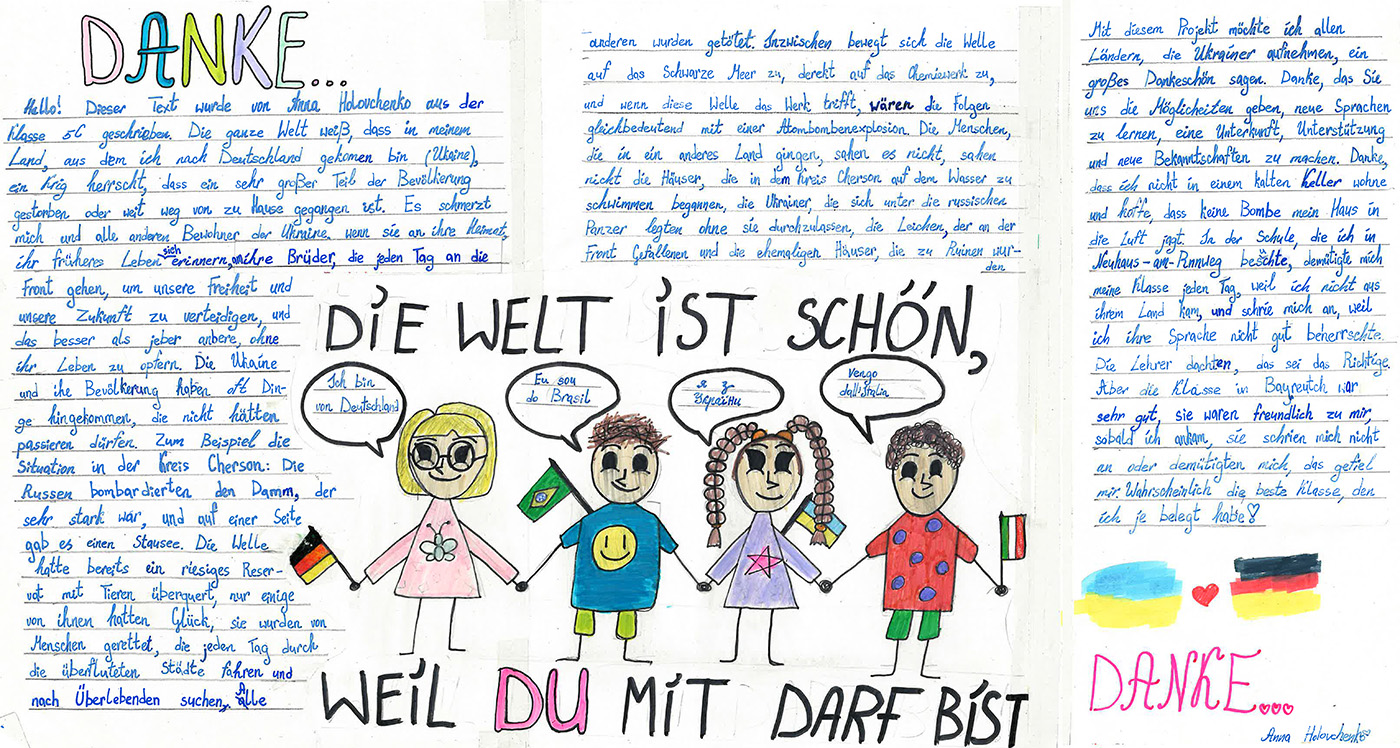 „Hallo. Die ganze Welt weiß, dass in meinem Land Krieg herrscht, dass ein sehr großer Teil der Bevölkerung gestorben ist oder vertrieben wurde. Es schmerzt mich und alle anderen Ukrainer, wenn sie sich an ihre Heimat und ihr früheres Leben zurück erinnern, wenn sie an die tapferen Männer und Frauen denken, die jeden Tag an die Front gehen, um unsere Freiheit und unser Land zu verteidigen. Die Ukraine und ihre Bevölkerung haben oft schon Dinge hingenommen, die nicht hätten passieren dürfen. Die Überschwemmung in Cherson ist zusätzlich sehr schwierig für die Bevölkerung, Minen schwimmen im Wasser, Häuser werden weggerissen und eine Welle rollt direkt auf das Chemiewerk zu, und wenn diese Welle das Werk trifft, wären die Folgen gleichbedeutend mit einer Atomexplosion. Die Menschen, die geflüchtet sind, müssen das nicht direkt miterleben: sie sehen nicht die Häuser, die im Kreis Cherson auf dem Wasser zu schwimmen begannen, die Ukrainer, die sich unter russische Panzer legten ohne sie durchzulassen, die Leichen, die an der Front gefallenen Soldatinnen und Soldaten und sie sehen auch nicht die einst mit Leben und Lachen gefüllten Häuser, die zu Ruinen wurden. Mit diesen Zeilen möchte ich allen Ländern, die Ukrainer aufnehmen, ein großes Dankeschön sagen. Danke, dass Sie uns die Möglichkeit geben, neue Sprachen zu lernen, eine Unterkunft zu haben und neue Bekanntschaften zu machen. Danke, dass ich nicht in einem kalten Keller wohnen und nicht befürchten muss, dass eine Bombe mein Haus in die Luft jagt. In meiner ersten Schule in Deutschland demütigte mich meine Klasse jeden Tag, weil ich nicht aus ihrem Land komme, sie schrien mich an, weil ich ihre Sprache nicht gut sprach. Die Lehrer machten nichts dagegen. Aber hier am MWG war die Klasse 5c sehr nett und freundlich zu mir; vom ersten Tag an. Ich fühle mich hier sehr wohl. Die 5c ist wahrscheinlich die beste Klasse, die ich je hatte.“