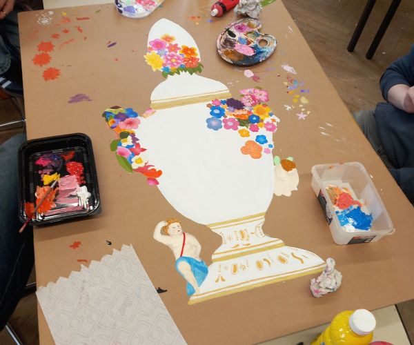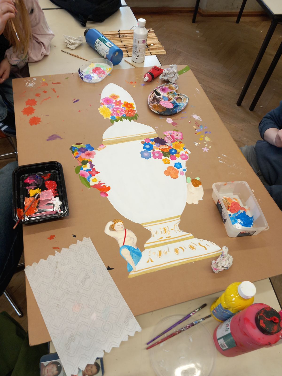 Zu Beginn des Schuljahres planten wir erst einmal unsere Vorgehensweise. Wir starteten mit einer Tour durch das Markgräfliche Opernhaus in Bayreuth und lernten somit viel über das Leben der Markgräfin Wilhelmine. Außerdem bekamen wir einen Einblick in das Kindertheater des Museums. So sahen wir auch, wo unsere Requisiten am Ende des Schuljahres einmal stehen werden. Durch die vielen Eindrücke und Einsichten in die Geschichte nahmen wir viel Inspiration für unsere darauffolgende praktische Aufgabe mit. Mit Unterstützung von Museumspädagogin Kornelia Weiß konnten wir die Planung vervollständigen. Unser Ziel war es, bis zum Sommer Requisiten für das Kindertheater anzufertigen. Frau Weiß legte einen Rahmen vor, in welchem wir uns frei ausleben konnten, und somit durfte jede kleine Gruppe ihre eigenen Ideen und Vorstellungen umsetzen. Manche widmeten sich Waldstücken und Kronleuchter zu, andere an einen Kamin und Krone und die dritte Gruppe an eine Vase. Wir trafen uns regelmäßig um gemeinsam an unseren Requisiten aus Pappe, Draht und Leim zu arbeiten. An manchen Tagen kamen wir gut voran, an manchen eher weniger. Trotz mühseligen Tagen erkannten wir oftmals, zwar kleine Fortschritte, dennoch stetige. In meiner Gruppe bemalten wir einen Karton zu einem Kamin mit vielen, vielen Blumen. Jede einzelne Blume zu malen war einerseits sehr anstrengend, dennoch schön und spannend zu sehen, was für Blumenarten einem einfallen, wenn man sich so lange damit beschäftigt. An unserem letzten Nachmittag werkelten wir teilweise bis 18 Uhr an unseren Requisiten und konnten sie so, mit großer Zufriedenheit und Erleichterung, dass wir es rechtzeitig geschafft haben, an Kornelia Weiß übergeben. Unsere Requisiten wurden auch schon gleich in Stücken verwendet, durch Bilder konnten wir auch direkt sehen, wie sie auf der Bühne zur Geltung kommen.
