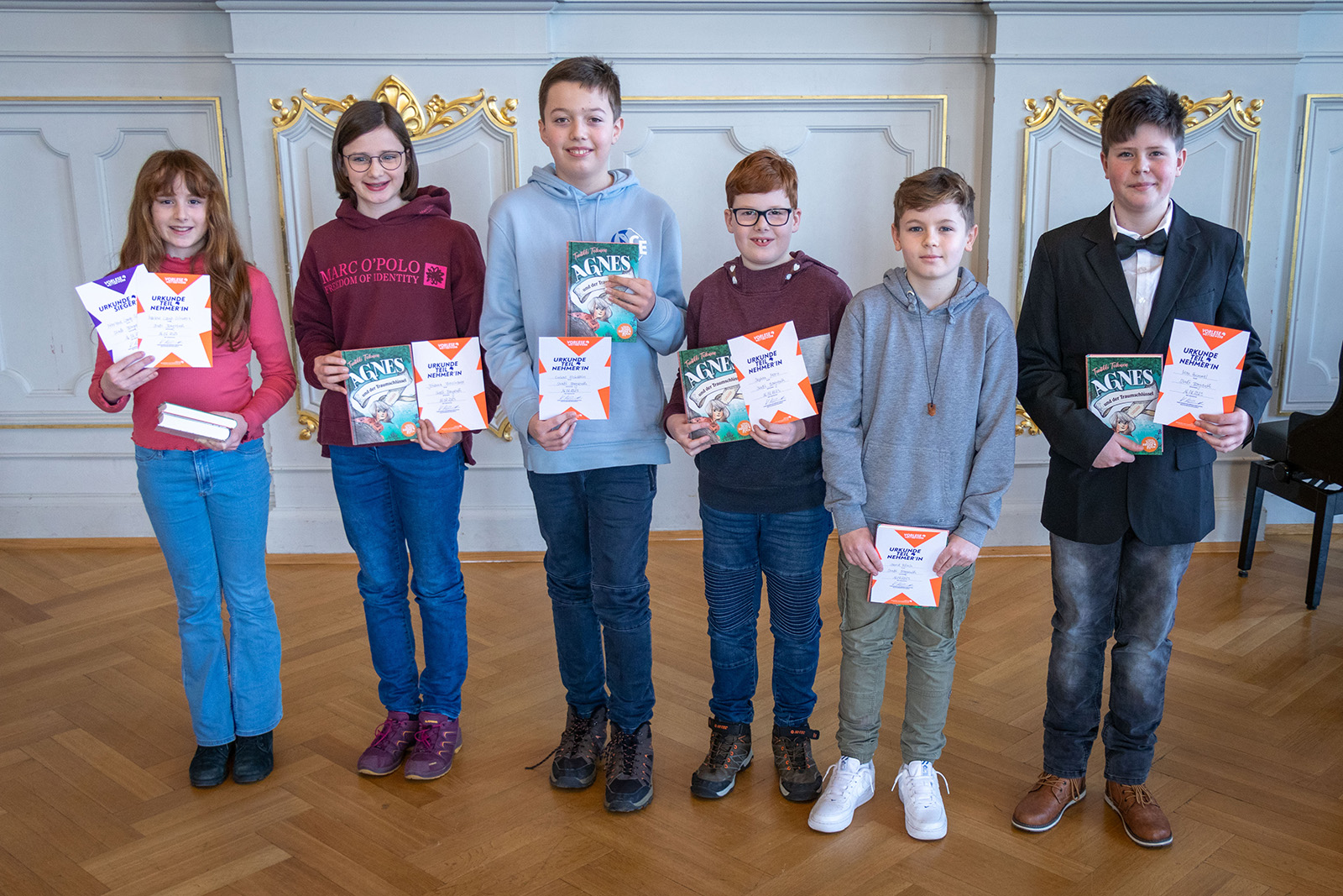 Am 16. Februar 2023 versammelte sich eine Gesellschaft aus Schülern, Eltern und Lehrern von sechs verschiedenen Bayreuther Schulen in der Aula unseres MWG. Nach einer musikalischen Einstimmung durch Olivia Maul (6b) am Cello und Gertraud Schina am Klavier hieß Schulleiterin Elisabeth Götz die Anwesenden herzlich willkommen. Deutsch-Fachschaftsleiter Dr. Steffen Arzberger begrüßte David Rösch, Johanna Froschauer, Lukas Eckstein, Marlene Lang-Schwarz, Max Hummel und Stephan Marx, allesamt Schulsieger beim diesjährigen bundesweiten Vorlesewettbewerb der 6. Klassen. Alle von ihnen trugen nun einen Ausschnitt eines von ihnen selbst gewählten Buches vor. In einer zweiten Runde galt es dann, einen unbekannten Text vorzulesen. Dieser stammte aus Jochen Tills „Pogo und Polente“ und führte zu großer Heiterkeit bei Lesern und Zuhörern. Besonders aufmerksam lauschten Michaele Baues, Marion Zinner und Dr. Klaus Wührl-Struller, die als Juroren entscheiden mussten, wer sich für den Bezirksentscheid qualifizierte. Während ihrer Beratung unterhielt Jan Woidig (6b) das Publikum am Klavier. Schließlich wurde das Ergebnis verkündet: Marlene Lang-Schwarz ist Stadtsiegerin. Ihr gilt unser aller Glückwunsch. Alle Teilnehmer bekamen einen Buchpreis, spendiert vom Börsenverein des deutschen Buchhandels.