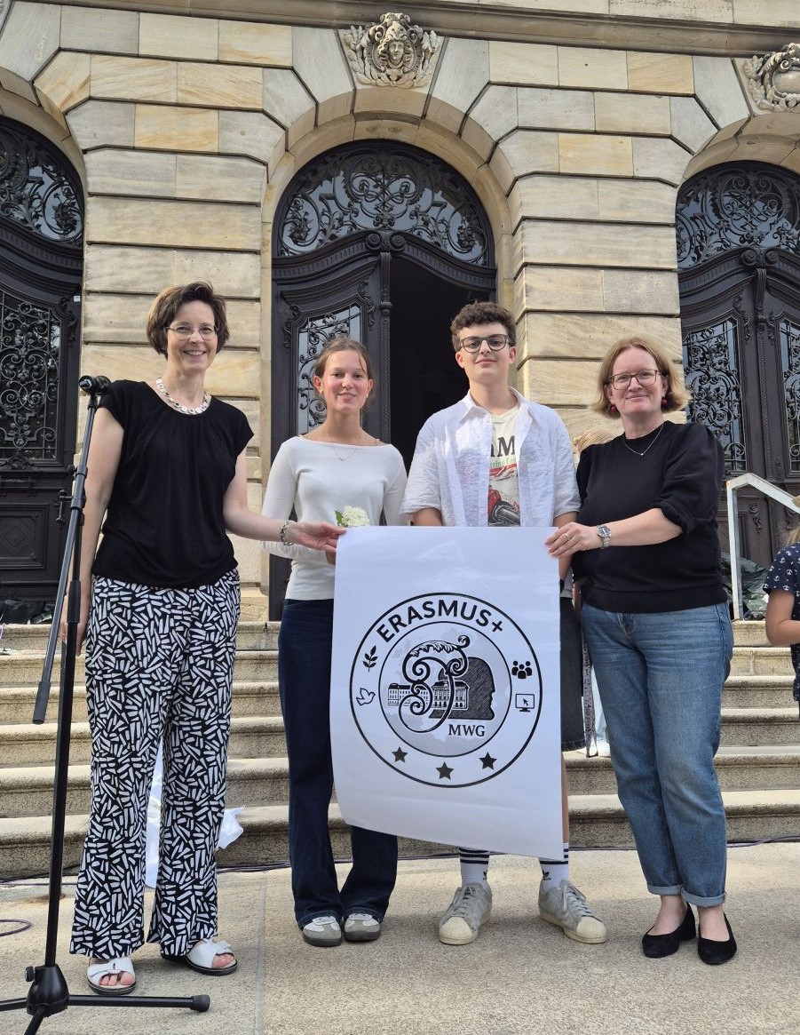 Bei unserem Schulfest konnten Frau Bode und Frau Hartig, die BNE- Beauftragte unserer Schule, das Erasmus+ -Logo des MWG präsentieren und Emil Baumann zu seinem Sieg beglückwünschen.