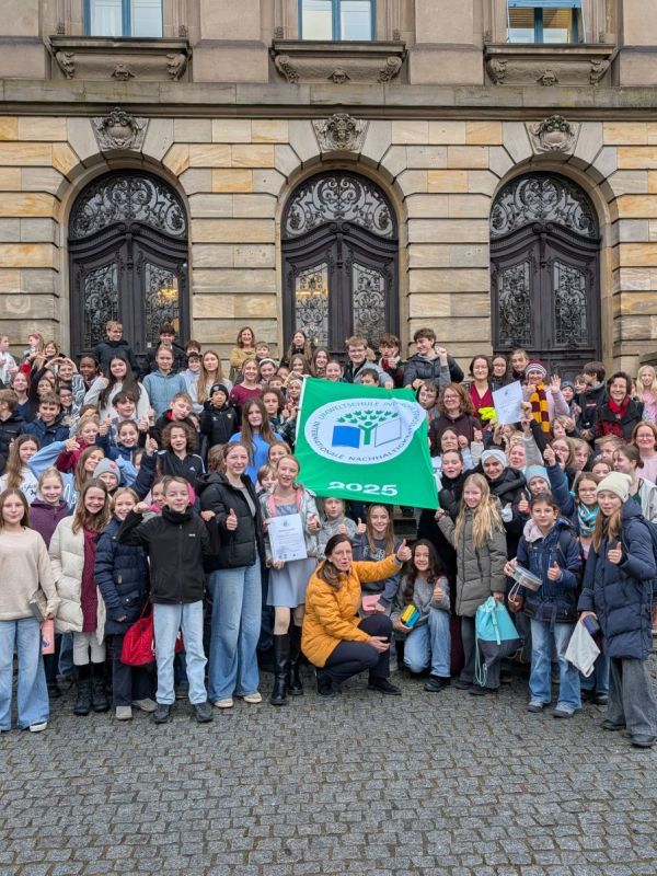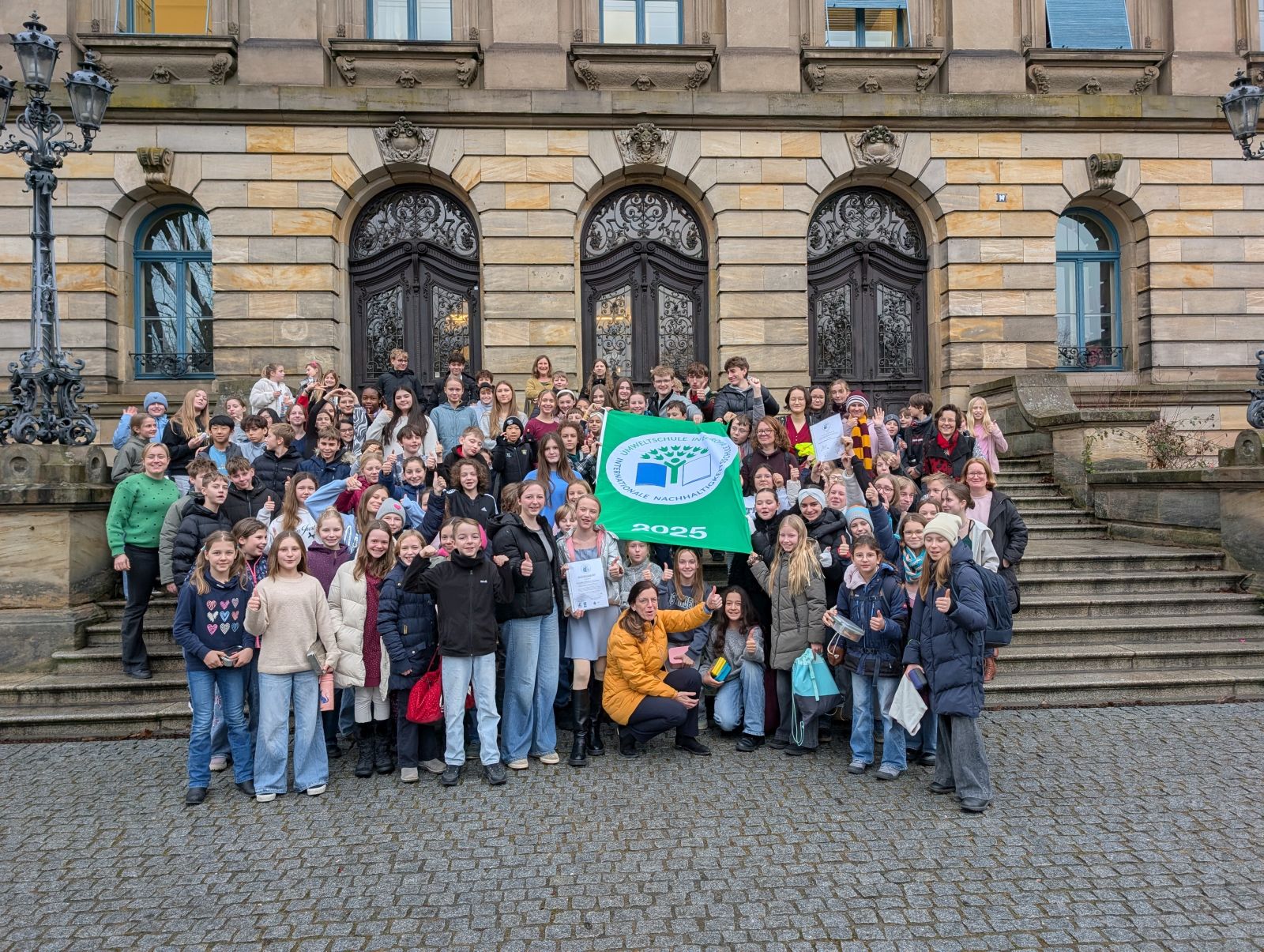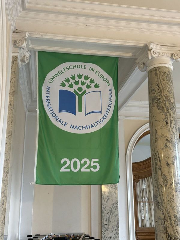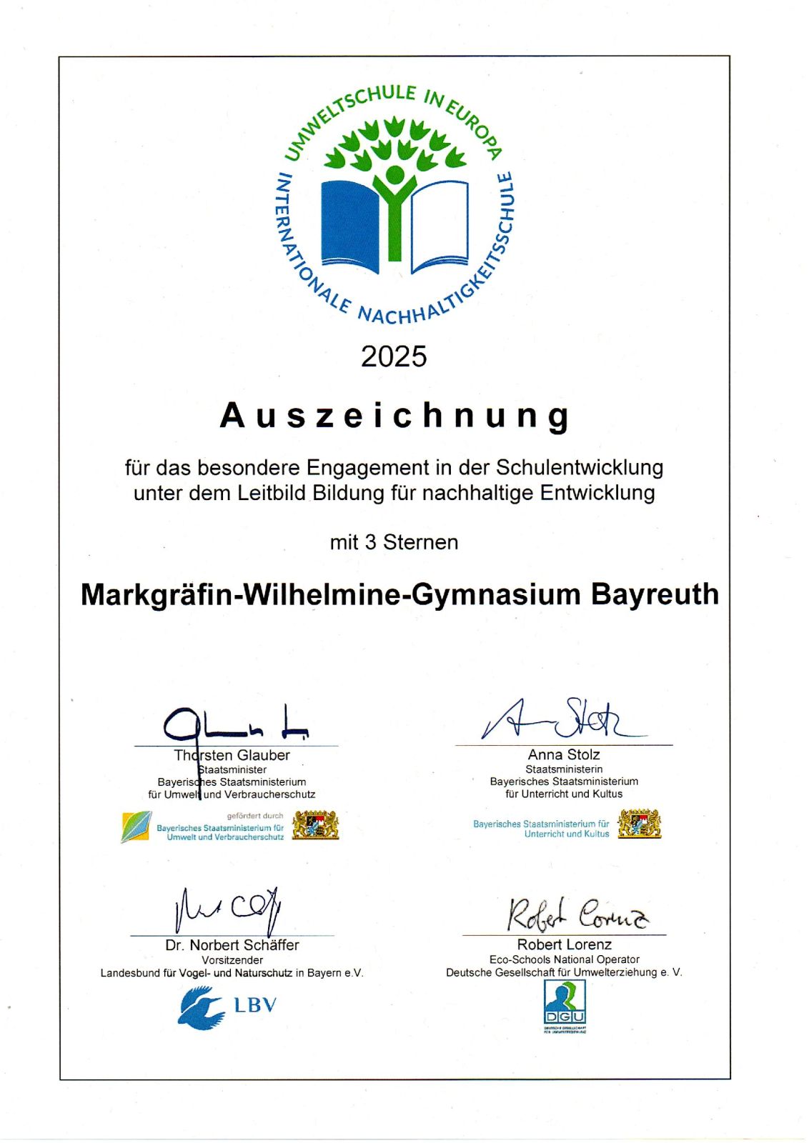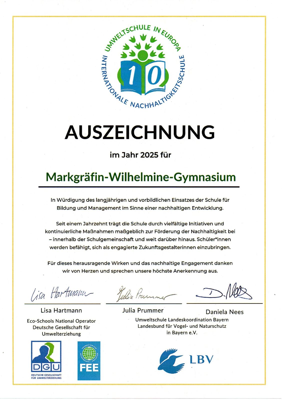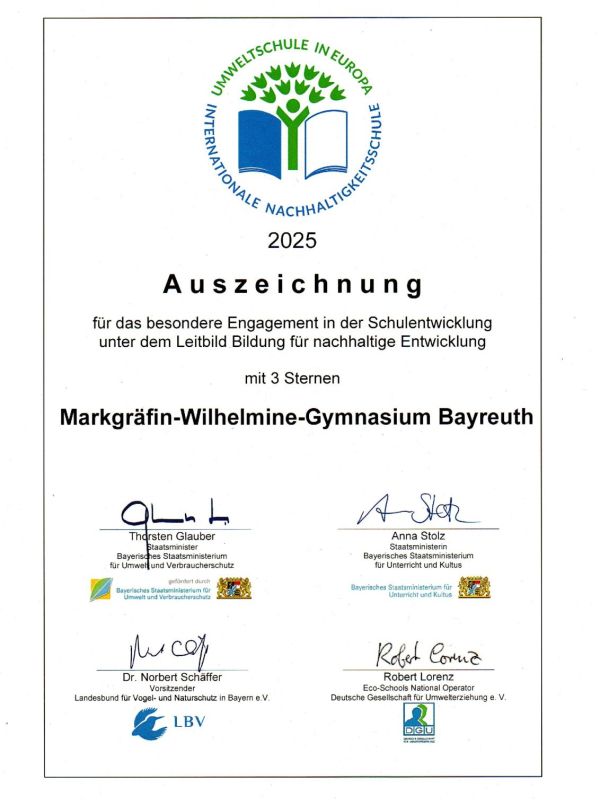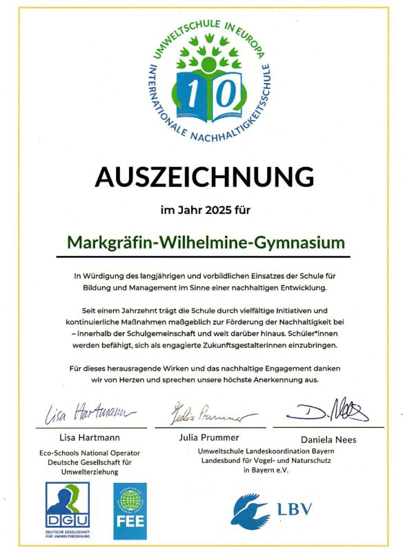 Im November 2025 erhielt das MWG zusammen mit mehr als 600 Schulen in Bayern für den Einsatz im vergangenen Schuljahr die Auszeichnung „Umweltschule in Europa / Internationale Nachhaltigkeitsschule“. Als sichtbares Zeichen dürfen die Schulen die neue Umweltfahne 2025 aufhängen. Zugleich wurden wir ausgezeichnet für unser langjähriges Engagement.