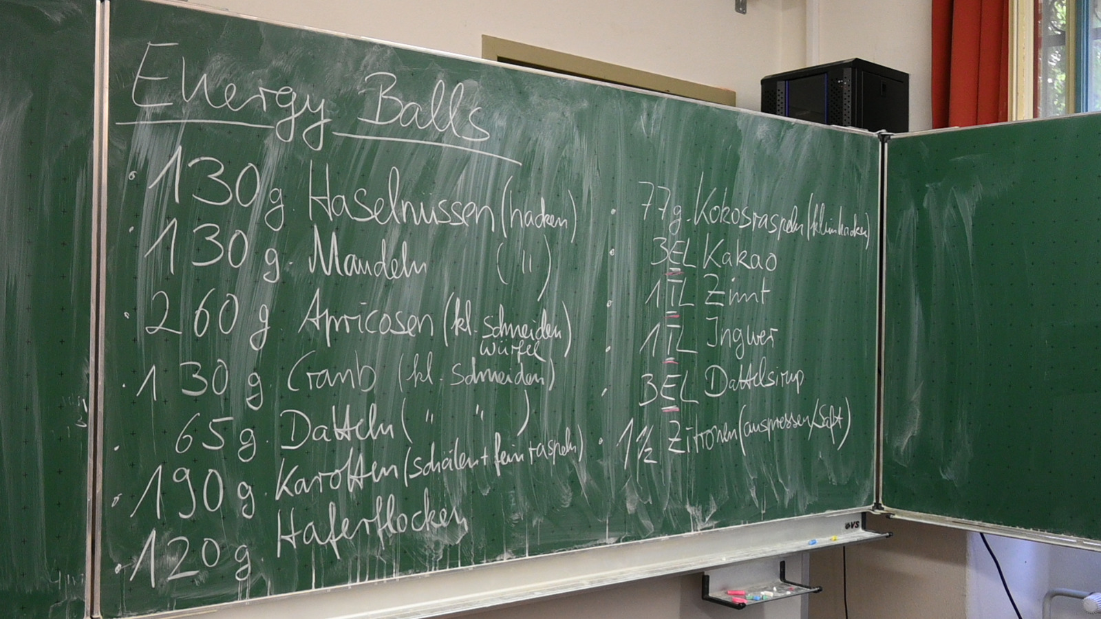 Frau Wallner und Frau Freise-Wengler veranstalten einen Workshop zum Fairen Handel anhand des Beispiels Schokolade. Dabei lernen die Schüler und Schülerinnen zuerst etwas über die verschiedenen Siegel, über die Produktion und die Nachhaltigkeit von verschiedenen Schokoladenmarken und bereiten anschließend selbst Energy Balls als gesunden Snack aus nachhaltigen Zutaten zu (Rezept siehe Foto).