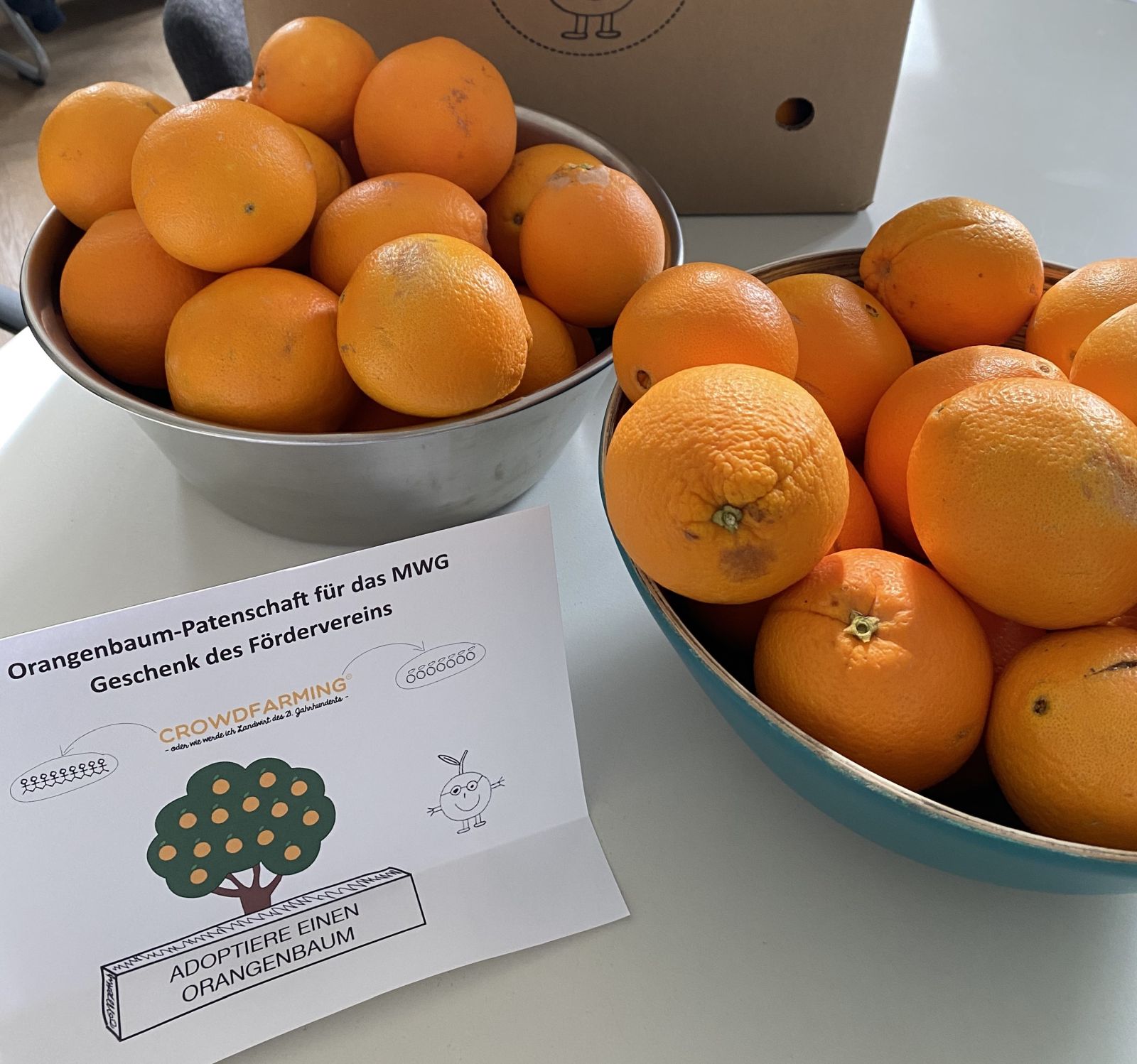 Der Förderverein des MWG hat die wiederholte Auszeichnung unserer Schule als Umweltschule zum Anlass genommen, das Engagement der Schulgemeinschaft zu würdigen. Unter der Leitung von Inken Bößert, der Vorsitzenden des Vereins, wurde deshalb eine Orangenbaum-Patenschaft initiiert. Mit dieser Patenschaft unterstützen wir einen nachhaltig arbeitenden landwirtschaftlichen Betrieb in Spanien.