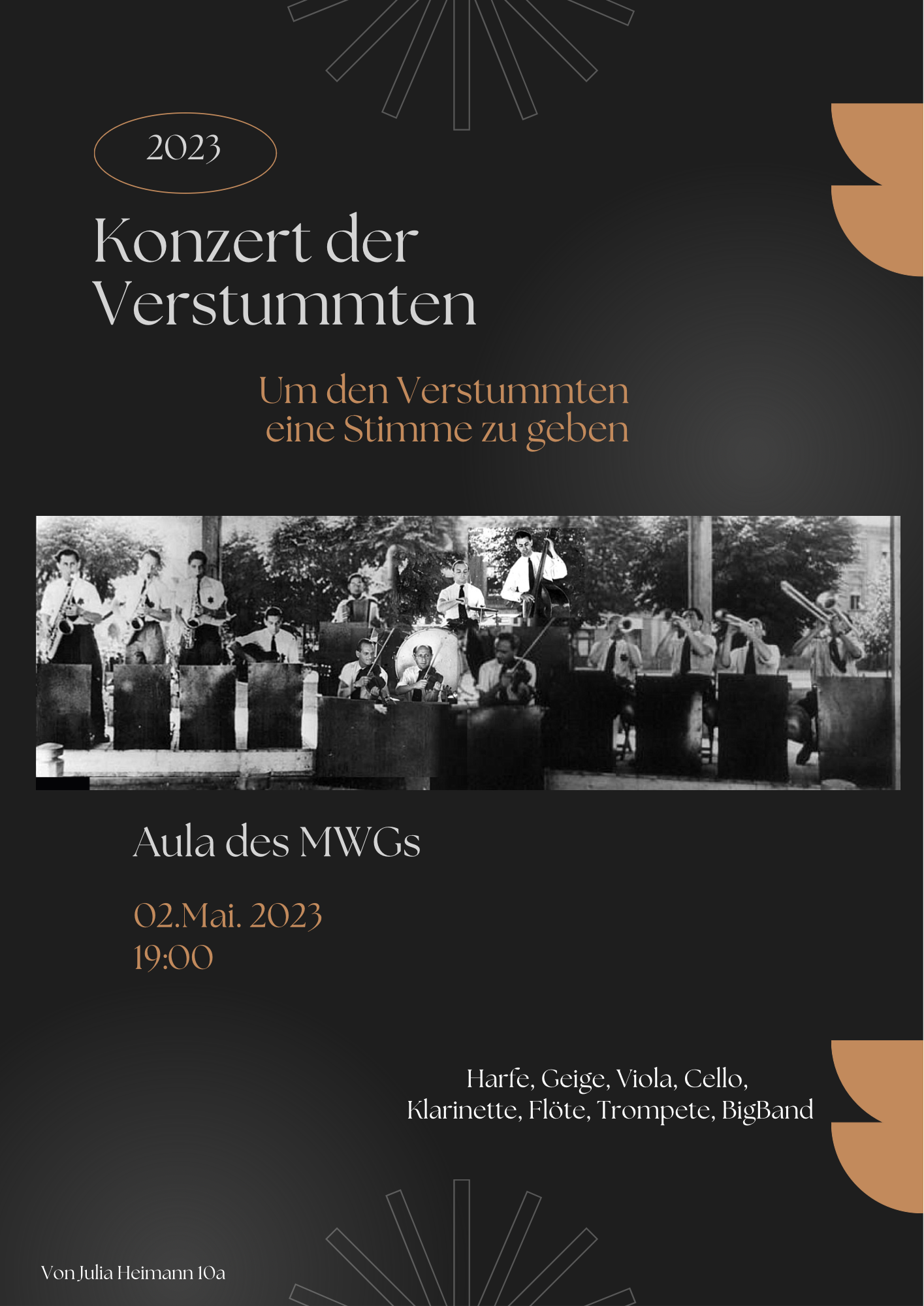 Mit großer Freude dürfen wir herzlich zu einem Konzert einladen, das am Dienstag, 2.5.2023 um 19 Uhr in der Aula unserer Schule stattfindet. „Das Konzert der Verstummten“ besteht aus der Darbietung von Werken vergessener, selten gespielter Kompositionen in Verbindung mit historischen Hintergründen. Unsere Schülerin Julia Heilmann, Klasse 10a, hat nicht nur den Impuls für dieses besondere Thema gegeben, sondern ist quasi die Intendantin, Regisseurin, Organisatorin dieses Konzerts. Mit einem unglaublichen Einsatz hat sie mit Unterstützung von Instrumentallehrkräften und Mitschüler*innen dieses Konzert zusammengestellt und organisiert. Es erklingen Werke für Harfe, Violine, Viola, Violoncello, Klarinette, Querflöte und BigBand.