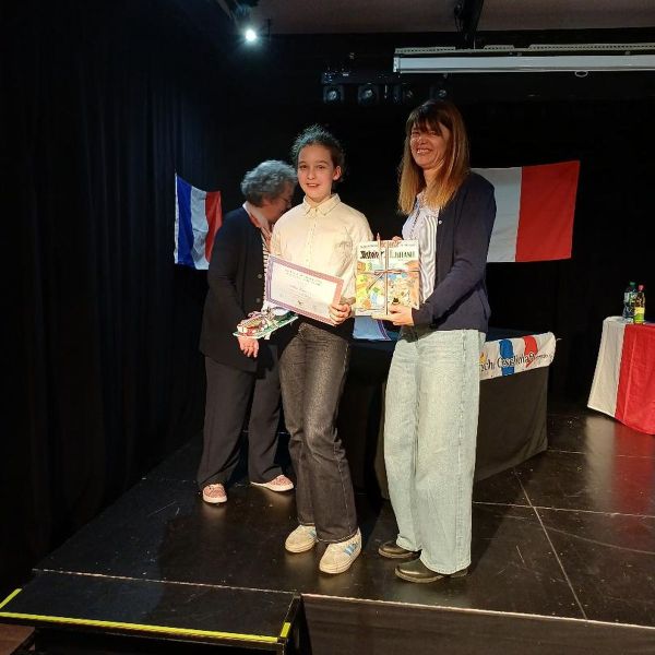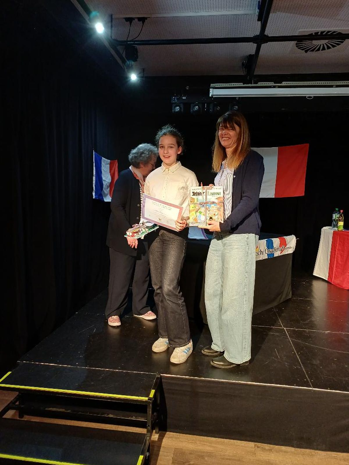 Auch dieses Jahr waren die Französisch lernenden Schülerinnen und Schüler der 8. Jahrgangsstufen der Bayreuther und Pegnitzer Gymnasien, der Gesamtschule Hollfeld sowie der 9. Jahrgangsstufe der beiden Bayreuther Realschulen dazu aufgerufen, ihr Können in einem Vorlesewettbewerb zu messen. Dieser fand am 15.4.26 am Nachmittag in der Kleinkunstbühne des Zentrums statt. Der Kurs 8cde des MWG schickte die Schülerin Elina Stannow ins Rennen. Elina suchte ein Kapitel aus der Lektüre „Opération cadeau“ von Anne-Marie Le Plouhinec aus, überlegte sich einige einführende Sätze und trug ihren Text vor einer fünfköpfigen französischen Jury souverän vor. In der 2. Runde mussten die drei angetretenen Schülerinnen des MWG, des GMG und des Gymnasiums Pegnitz sowie der Schüler des WWG einen recht schwierigen unbekannten Text vorlesen, den die Jury ausgewählt hatte. Überbrückt wurden die Beratungspausen der Jury durch Einblicke in die Arbeit und die Termine der DFG im Jubiläumsjahr der Partnerschaft zwischen Bayreuth und Annecy, insbesondere aber durch ein liebevoll erstelltes Buffet mit französischen Spezialitäten. Es gab das grüne Getränk Diabolo menthe, Madeleines, französische Kekse, Karamellstangen der Marke Carambar, so dass auch hier vor allem im Zusammenhang mit der tollen Dekoration für französisches Ambiente gesorgt wurde. Elina gewann mit ihrem lebendigen Vortragsstil den 2. Platz, Siegerin wurde die Schülerin des GMG. Félicitations, Elina!