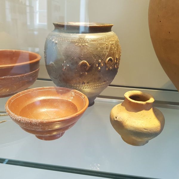 Nach einer Stärkung in der Mittagspause konnten wir im Limes-Informationszentrum viele römische Funde betrachten, die einen Einblick in das römische Leben geben. Ungewöhnlich ist ein Baby-Saugfläschchen aus Keramik. Besonders gut gefielen manchen Schülerinnen goldene oder silberne Schmuckstücke, die zum Teil in der Therme gefunden wurden. Den Höhepunkt stellten die Götterstatuen dar, wie der beliebte Merkur, verschiedene Venusstatuetten oder Herkules mit seinem Löwenfell und dem von ihm erlegten Eber in Kleinformat.