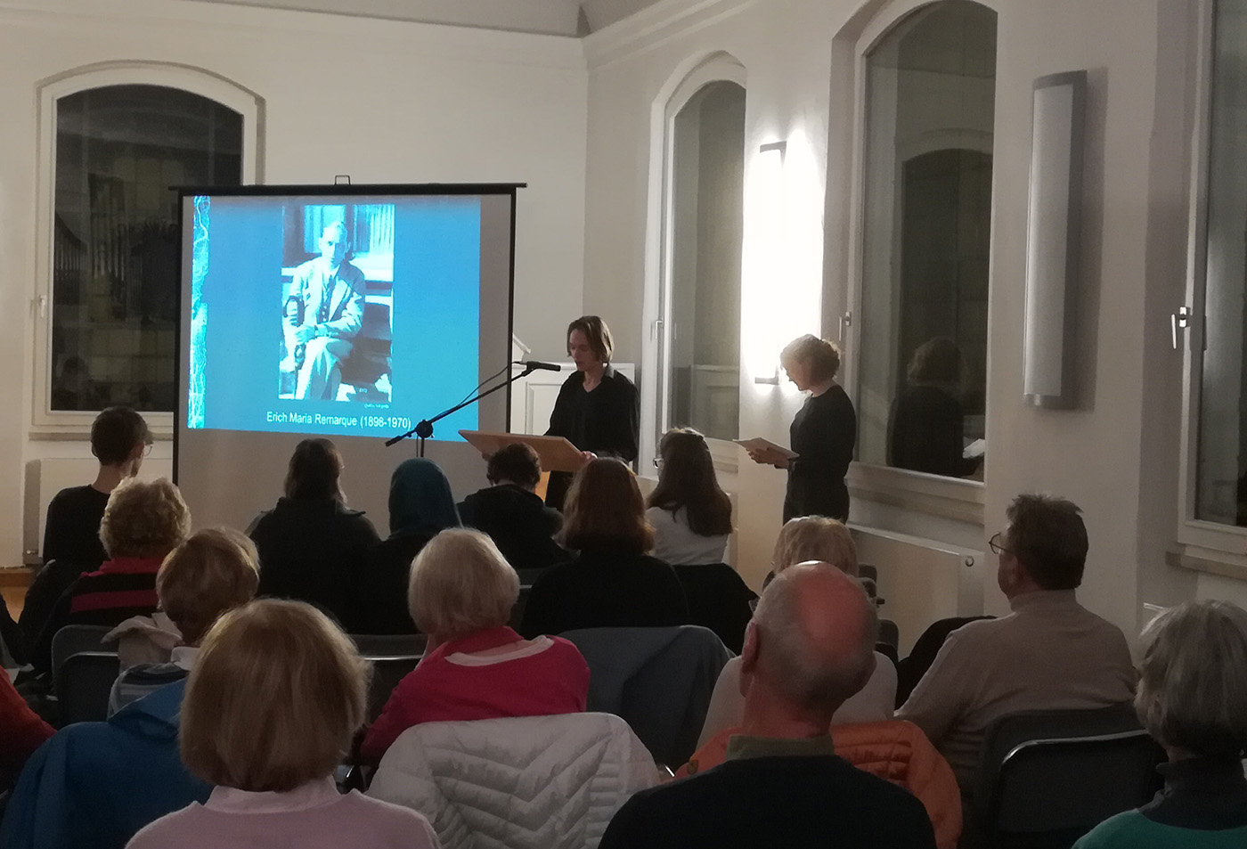 Am 9. November 2022 wurde der „Schicksalstag der Deutschen“ zum Anlass genommen, diese damals verbrannten Werke in der Reformierten Kirche Bayreuth mit einer Lesung zu ehren. Nach einer Begrüßung durch Pfarrer Simon Froben und einer kurzen Hinführung durch Studienleiterin Dr. Angela Hager vom Evangelischen Bildungswerk lasen SchülerInnen aus dem Deutschkurs von Dr. Steffen Arzberger aus Werken von Bertolt Brecht, Erich Kästner, Erich Maria Remarque, Kurt Tucholsky, Eva Leidmann, Annette Kolb, Jakob Wassermann, Oskar Maria Graf und Joachim Ringelnatz. Jeweils zu den Texten passende Musik boten Arman Depperschmidt, Thomas Kroter und Dana Maier (Q12).