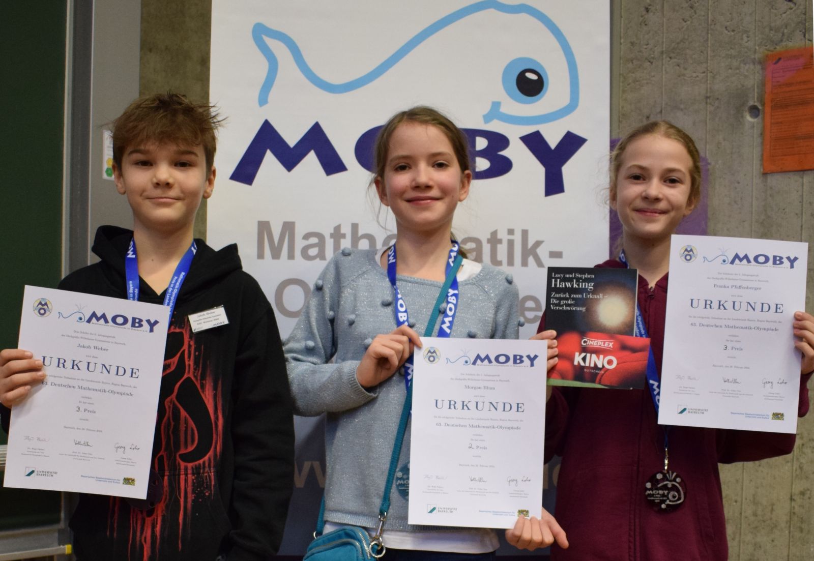 Am 28. Februar fand an der Uni Bayreuth die Finalrunde der 63. Mathematik-Olympiade Bayern für die Region Bayreuth/Hof für die Klassenstufen 5 und 6 statt. Vier Mathecracks des MWG Bayreuth qualifizierten sich für diese dritte und letzte Runde des Wettbewerbs und durften sich mit 26 anderen qualifizierten Schülerinnen und Schülern messen. Da Johannes Schafföner am gleichen Tag für das MWG mit Jugend forscht unterwegs war, konnte er leider nicht anwesend sein. Die anderen drei MWGlerInnen konnten aber dabei sein und schnitten in der 3 1/2-stündigen Wettbewerbsklausur sehr erfolgreich ab. Sowohl Franka Pfaffenberger (5b) als auch Morgan Blum (5d) und Jakob Weber (6d) kamen unter die zwölf Preisträgerinnen und Preisträger des Tages. Franka und Jakob erlangten jeweils einen tollen 3. Preis und hatten damit in ihrer Alterskategorie nur drei bzw. zwei andere Teilnehmerinnen und Teilnehmer vor sich. Morgan erreichte sogar einen hervorragenden 2. Preis und wurde im Wettbewerb der 5. Klassen damit Zweitplatzierte. Die einzigen ersten Preise der beiden Jahrgänge gingen an zwei Jungen aus Hof.