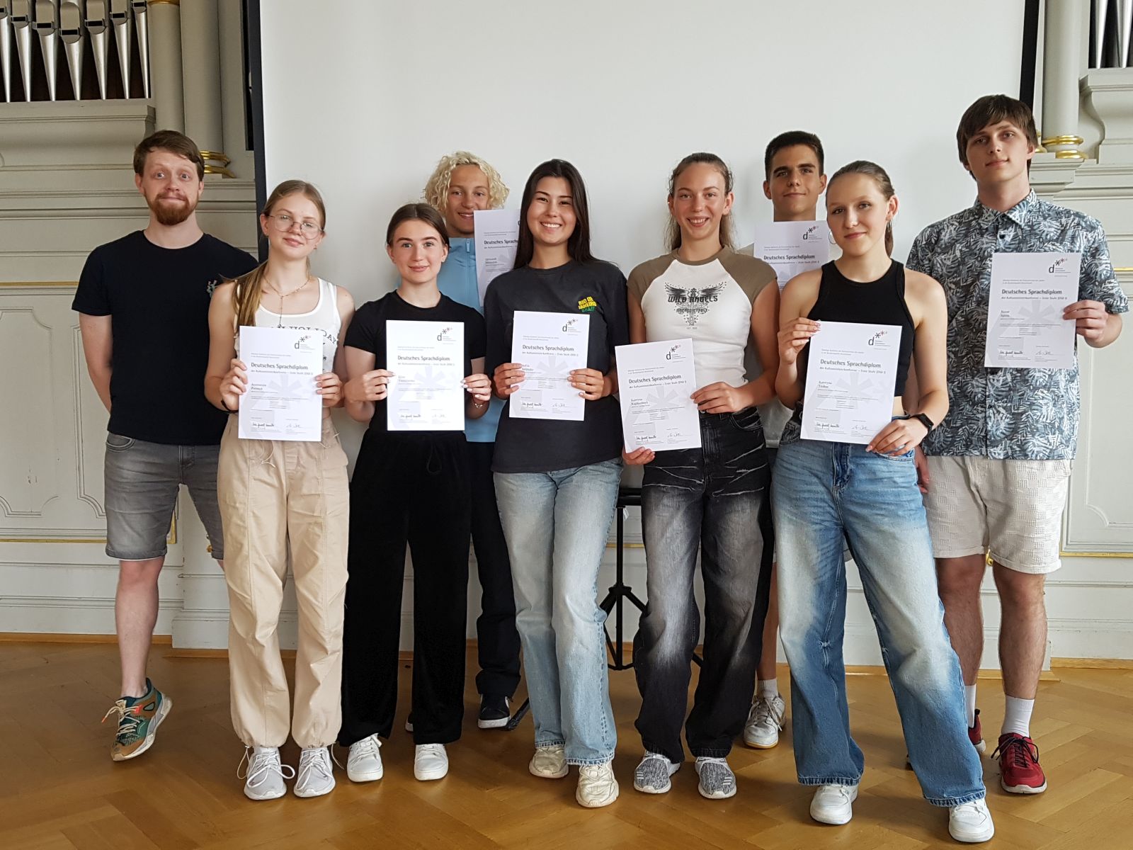 Acht unserer ukrainischen Schüler und Schülerinnen haben an den Prüfungen zum Deutschen Sprachdiplom teilgenommen und alle haben das B 1-Niveau erreicht. Frau Staatsministerin Anna Stolz hat den Schülern und Schülerinnen in einer Videobotschaft zu dieser Leistung gratuliert. Maßgeblich hat der Deutschlehrer Herr Stepan Kuts zum Erfolg seiner Schützlinge aus der Ukraine beigetragen. Wir gratulieren allen sehr herzlich und wünschen ihnen alles Gute auf ihren weiteren Wegen!