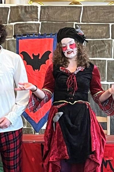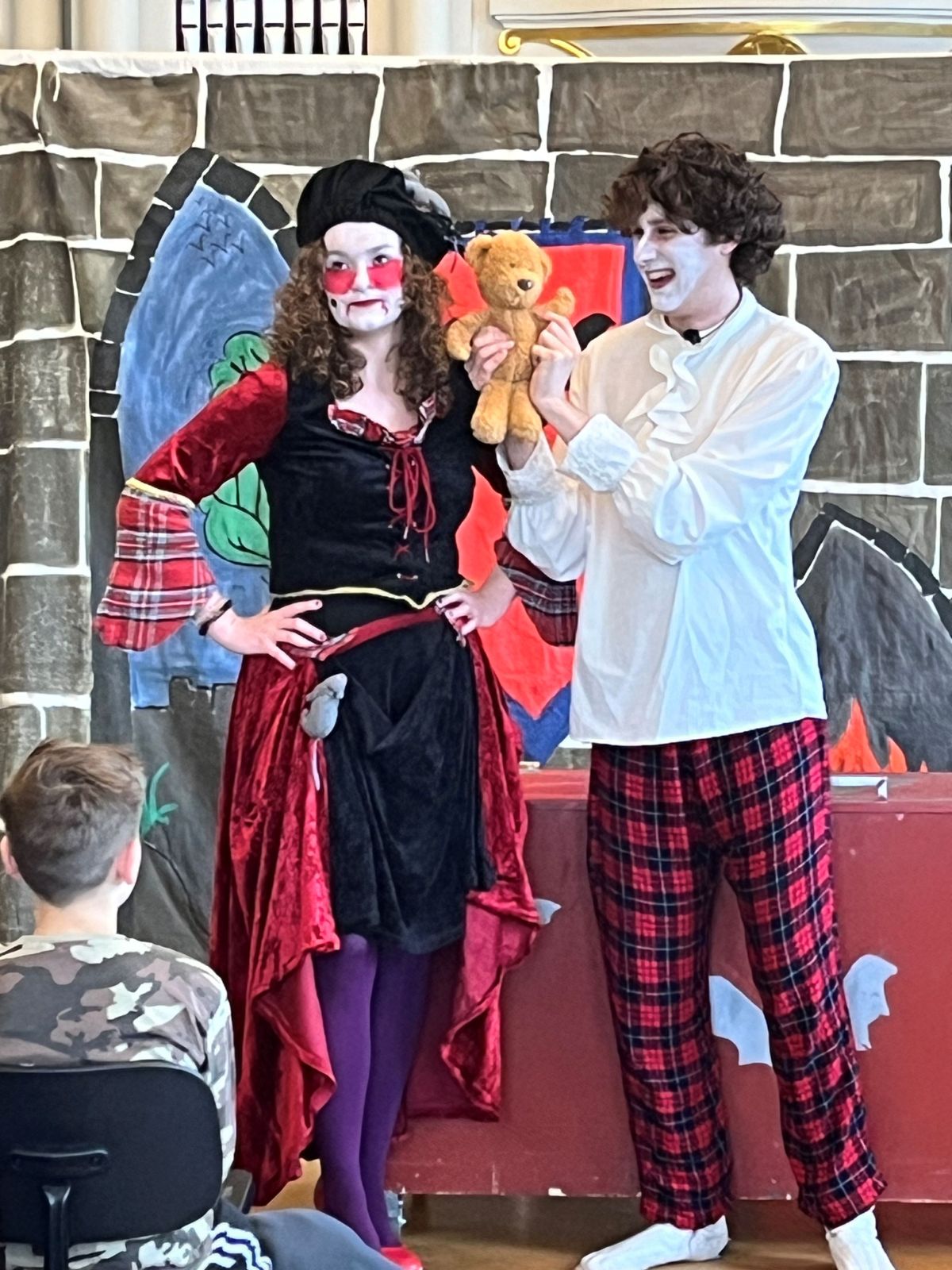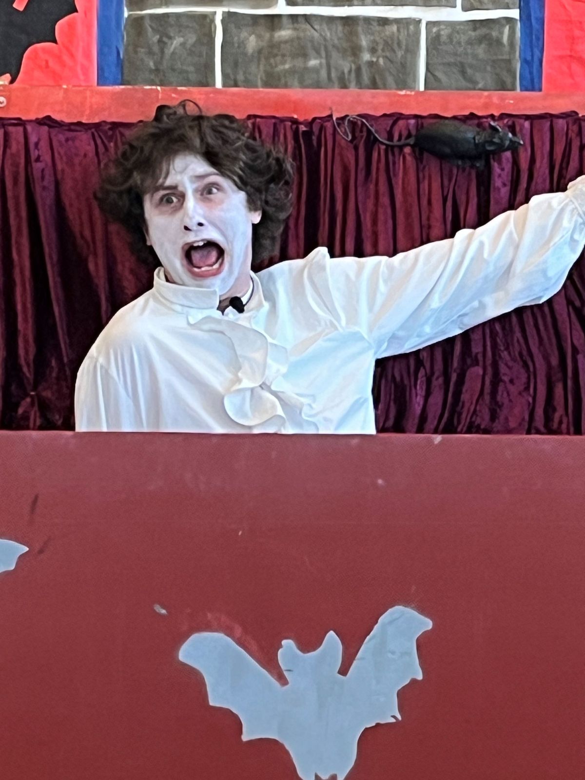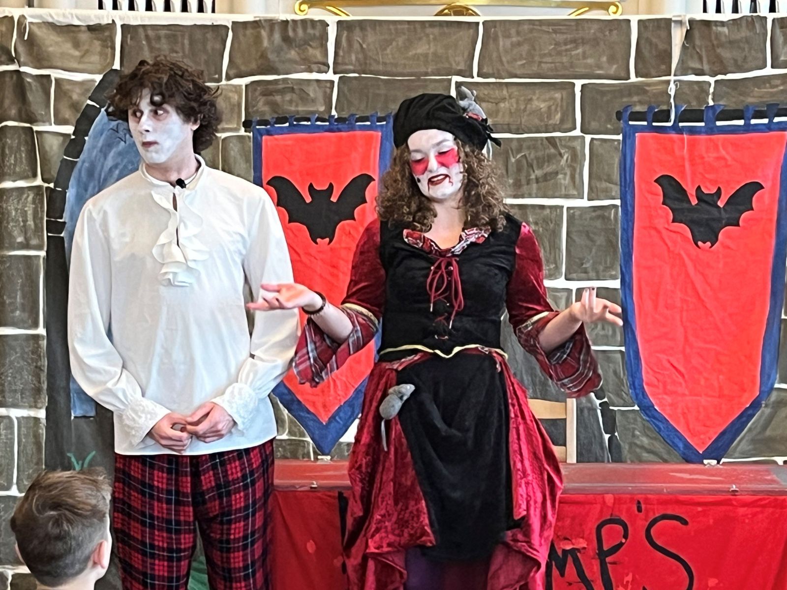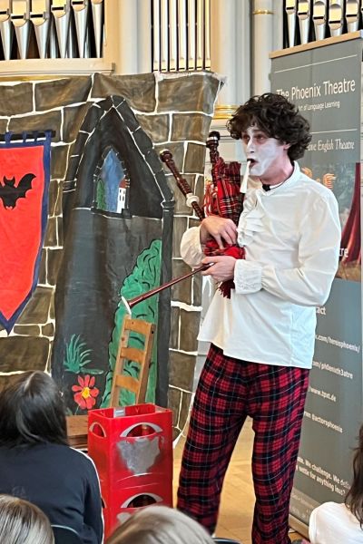 Da wäre auch unsere Studien- und Berufsberatung ratlos: was tun, wenn man als einziger Sohn und Erbe eines schottischen Vampirclans entgegen aller Erwartungen der dominanten Mutter eben nicht in den Betrieb der familieneigenen Blutbank einsteigen will? Sondern von einer Zukunft als Eisdielenbesitzer träumt? Die Schülerinnen und Schüler der sechsten Jahrgangsstufe hatten am English Theatre Day jedenfalls viel Spaß dabei, den Vampirjungen lautstark dabei zu unterstützen, eine Lösung für dieses Problem zu finden. Einige wurden von dem Schauspielergespann des Phoenix Theatres sogar mit auf die Bühne geholt! – Ernstere Töne schlugen Sophie und Anthony für unsere Achtklässler an. Das wirklich anspruchsvolle Stück forderte dem Publikum einiges ab, da die Schauspieler englische Jugendsprache fast im Originaltempo boten. Aber die Themen dürften vertraut gewesen sein: Verliebtsein und erste Beziehungen, seinen Platz finden im Schulalltag mit Cliquen und Außenseitern, Unsicherheiten und der Wunsch nach Zugehörigkeit, Optimismus und Hoffnung, Ausgrenzung und Mobbing … all das unendlich potenziert durch die Möglichkeiten und Gefahren der omnipräsenten Handys, was für eine Figur im Stück tragisch endete. Konzentration bis zuletzt und anschießend eine lebhafte Fragerunde mit den Schauspielern – das Team vom Phoenix Theatre hat wieder begeistert.