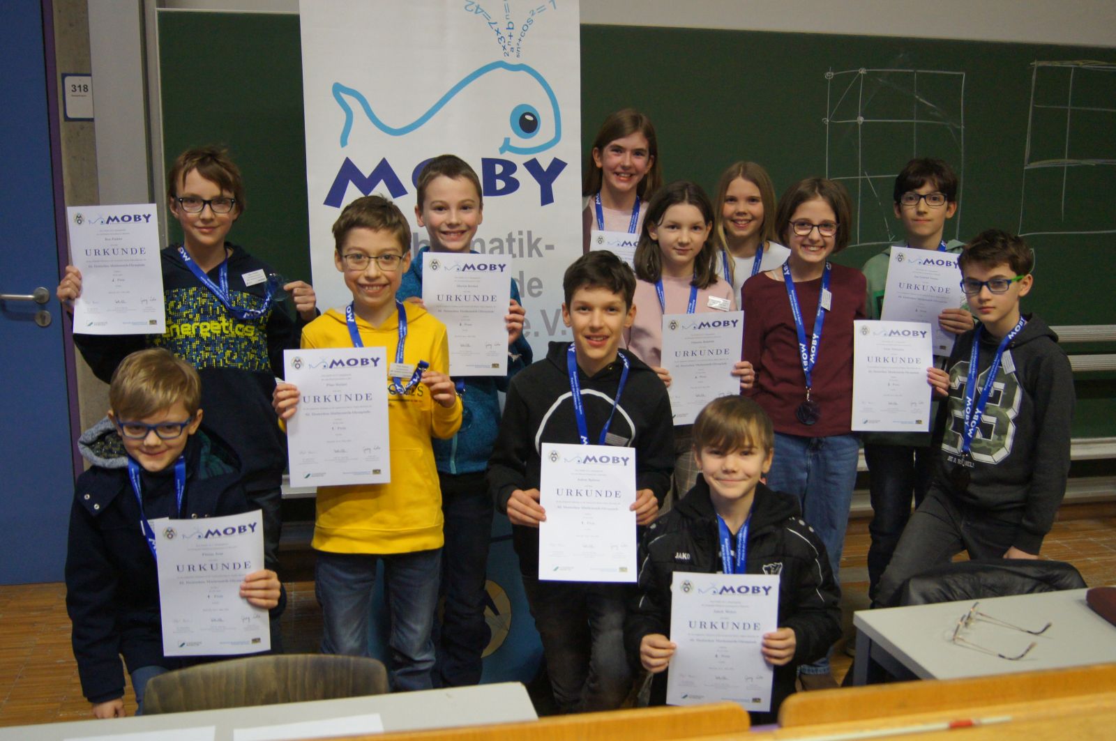 Die Mathematikolympiade findet jedes Jahr in mehreren Runden statt. Alle teilnehmenden Schülerinnen und Schüler starten im Herbst mit einem Hausaufgabenwettbewerb. Ein paar Wochen später findet dann eine schulinterne Klausur statt, bei der alle Teilnehmerinnen und Teilnehmer über mehrere Stunden versuchen Matheaufgaben zu lösen. In diesem Schuljahr hatten wir 14 Kinder, die die Klausur mitgeschrieben haben.