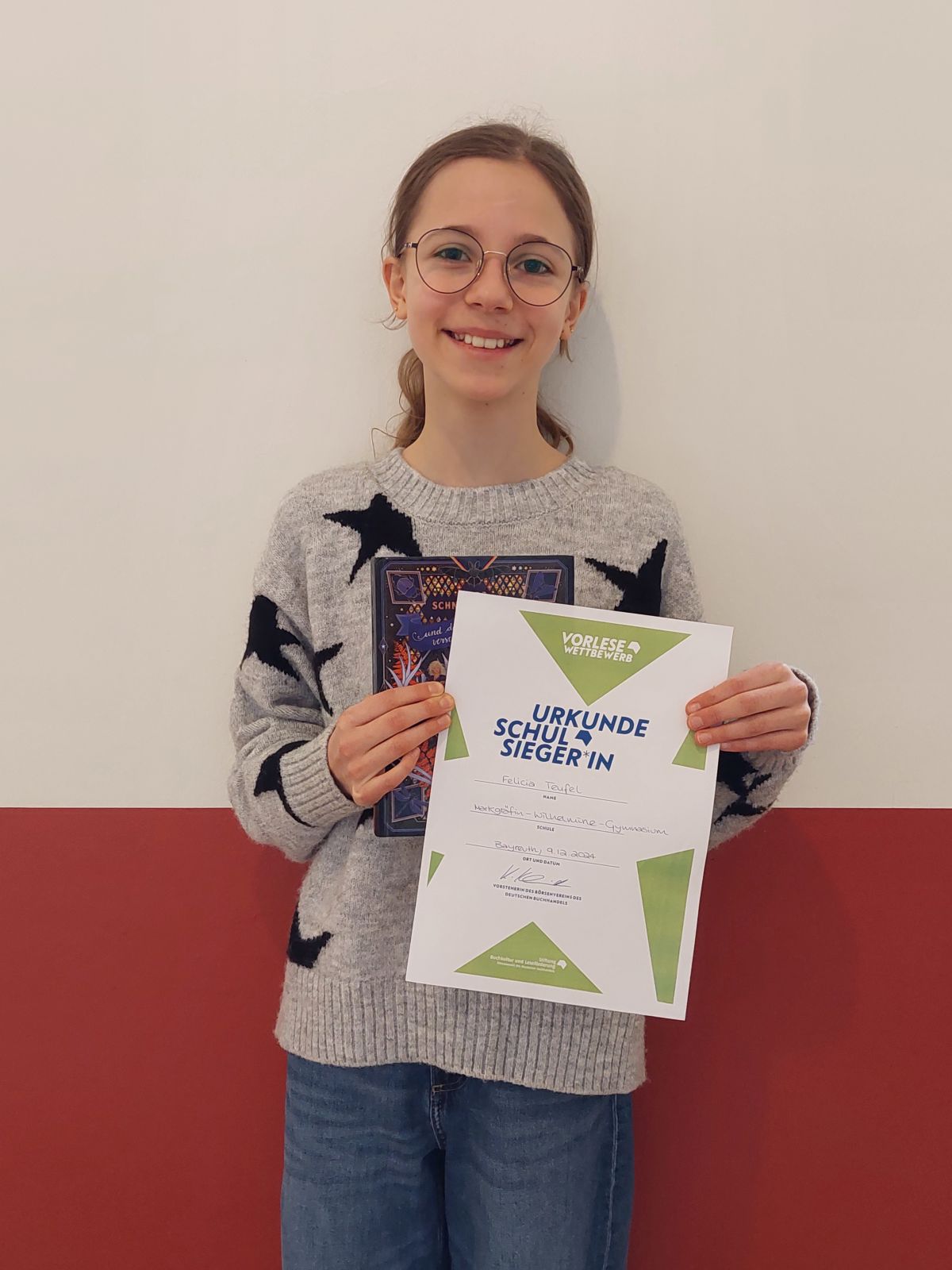 Die Entscheidung fiel der Jury, die aus den vier Deutschlehrkräften der 6. Klassen bestand, nicht leicht, da alle die Texte überzeugend darboten. Letztendlich setzte sich aber Felicia Teufel aus der 6a durch und vertritt nun das MWG in der nächsten Runde beim Stadtentscheid Bayreuth. Viel Erfolg!