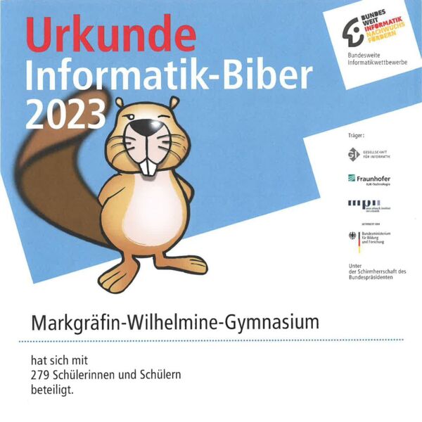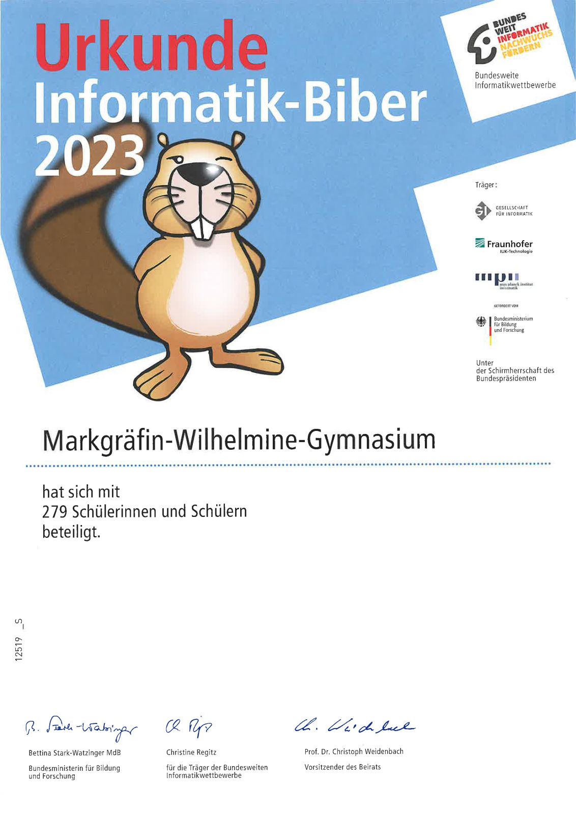 Wir vom MWG freuen uns, dass sich im Schuljahr 2023/24 insgesamt 279 Schülerinnen und Schüler am Wettbewerb beteiligt haben und wir 12 Preisträgerinnen und Preisträgern (darunter 4 erste Plätze) zu herausragenden Ergebnissen gratulieren zu dürfen. Herzlichen Glückwunsch von der Fachschaft Informatik!