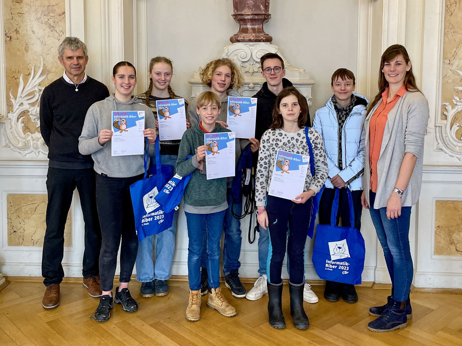 Im Bild von links nach rechts: StD Eduard Stopfer, Luise Kimler, Svantje Piro, Johann Gollner, Noah Ritter, Ambre Guiot, Linus Grelka, Timor Albers und StRin Manuela Deuerlein. Es fehlen Ailing Schindler, Julius Schaefer, Louis Bayer, Justus Büchner und Max Teichmann