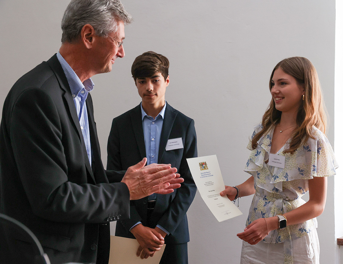 In einem Festakt erhielt Laura Finke in München ihre Urkunde über das Stipendium von Kultusminister Prof. Dr. Michael Piazolo persönlich überreicht. Auch die Generalkonsulin für Frankreich, Frau Corinne Peirera, gratulierte herzlich und begrüßte die enge Verbindung zwischen Bayern und Frankreich.