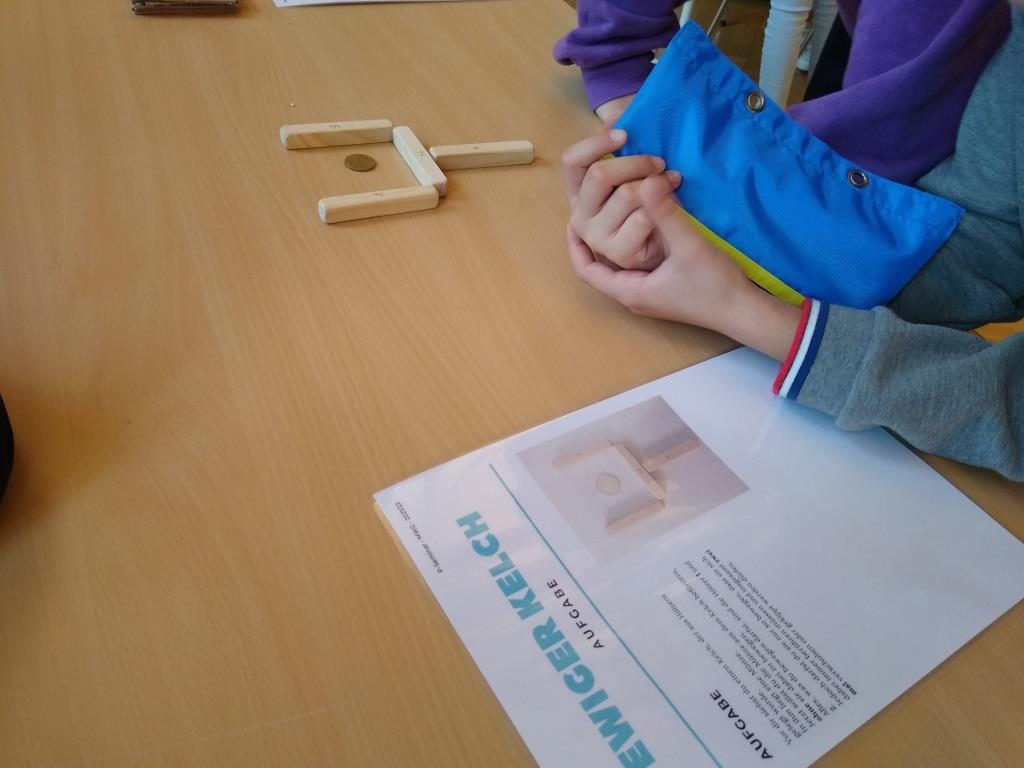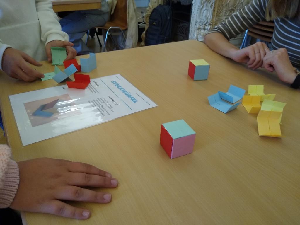 Natürlich kamen auch die Knobel-Fans nicht zu kurz. Ob beim Tangrampuzzle (Legen von großen geometrischen Figuren aus verschiedenen kleinen), beim Befreien einer Münze aus einem aus Holstäbchen gelegten Kelch, ohne dessen Form zu verlieren und ohne die Münze dabei zu bewegen, oder beim Bau eines Würfels aus kleineren Würfeln.