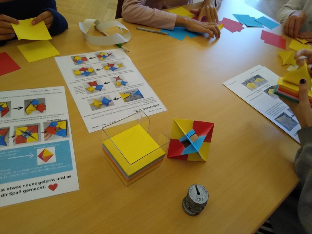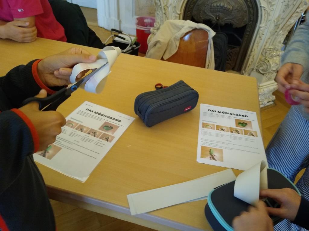 Genauso kann ein Würfel auch aus 6 kleineren Papier-Quadraten entstehen. Oder man nimmt die doppelte Anzahl und faltet daraus ein Oktaeder. An der nächsten Station waren es Papierstreifen, die erst geklebt und durchgeschnitten wurden. Wie bereits der Mathematiker Möbius erkannt hat, bleibt es durch die richtige Drehung trotzdem bei nur einem kompletten Streifen.