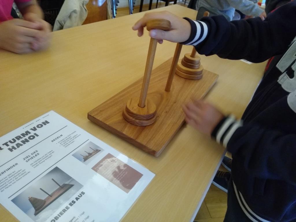 Die mit Abstand schwerste Station war der „Turm von Hanoi“. Hier mussten die Kinder durch gezieltes Umstecken der Ringe einen einzigen Turm bilden, bei dem die Ringe von unten nach oben in gleichmäßigen Schritten immer kleiner werden.